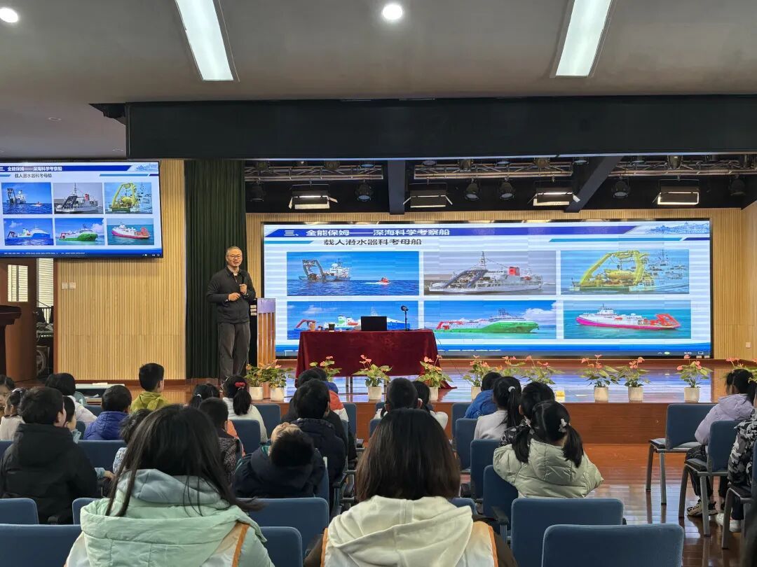 在第一节大师课堂上,来自中国船舶集团七〇四所研究员、“奋斗者”号载人潜器水面收放系统主管设计师丁鑫受邀授课,带来《逐梦海底一万米》主题科普课程。授课专家结合自身科研经历,通俗易懂地讲述我国载人潜水器“奋斗者”号从技术跟跑到全球领跑的奋斗历程,展现大国重器背后的科研坚守与创新精神。