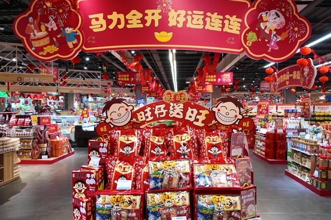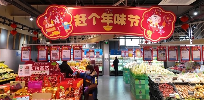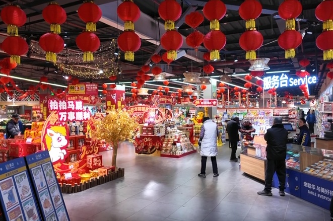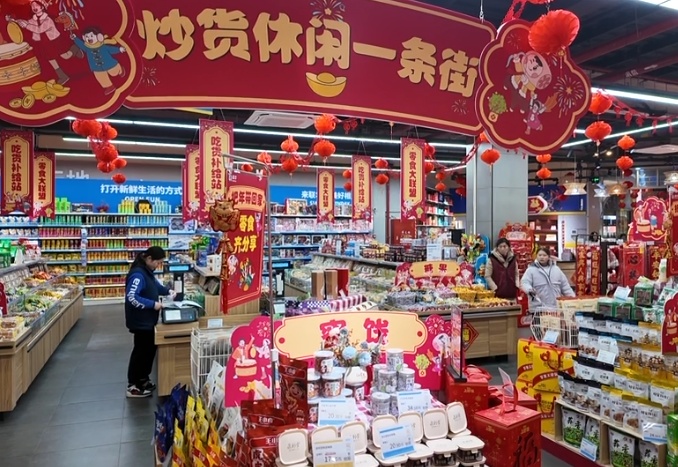 超市内,从传统糕点、南北炒货到包装精美的春节礼盒一应俱全,货架上还摆满了形态可爱的马年玩偶和寓意吉祥的各式挂饰。“过年了,买点饼干送人,再挑些福字回家贴。这个超市大、东西多,布置得也很喜庆。”一位正在采购的市民说道。红火的氛围和丰富的商品,吸引了不少顾客前来一站式购齐年货。