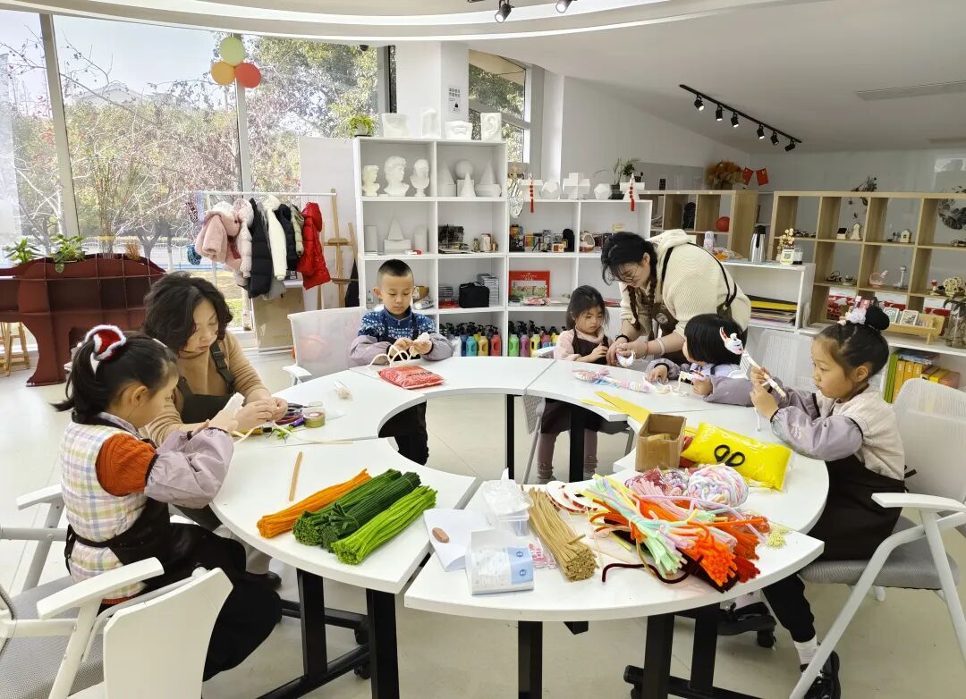 走进滨江大道边的一座白色小楼,耳边传来阵阵稚嫩的笑声和轻柔的低语。拾级而上,二楼的活动室里通透明亮,目光所及尽是充满童真的画作与手工作品,仿佛步入了一个小小的艺术天地。房间中央的圆桌旁围坐着五个孩子,正在老师的指导下做手工。五颜六色的扭扭棒在小手中弯折、缠绕,一点点变成花朵、小动物,或是孩子们想象中的奇妙模样。靠窗的一侧,两个孩子俯身于画纸前。颜料在纸上缓缓晕开,自由与想象在其间悄然生长。