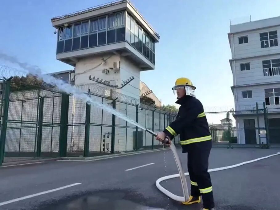 接带、启阀、喷射,整套动作规范到位。消防队员紧握水枪、稳压控水,水柱精准命中目标,有效压制火势且精确控制水压,满足监管场所复杂环境灭火要求。