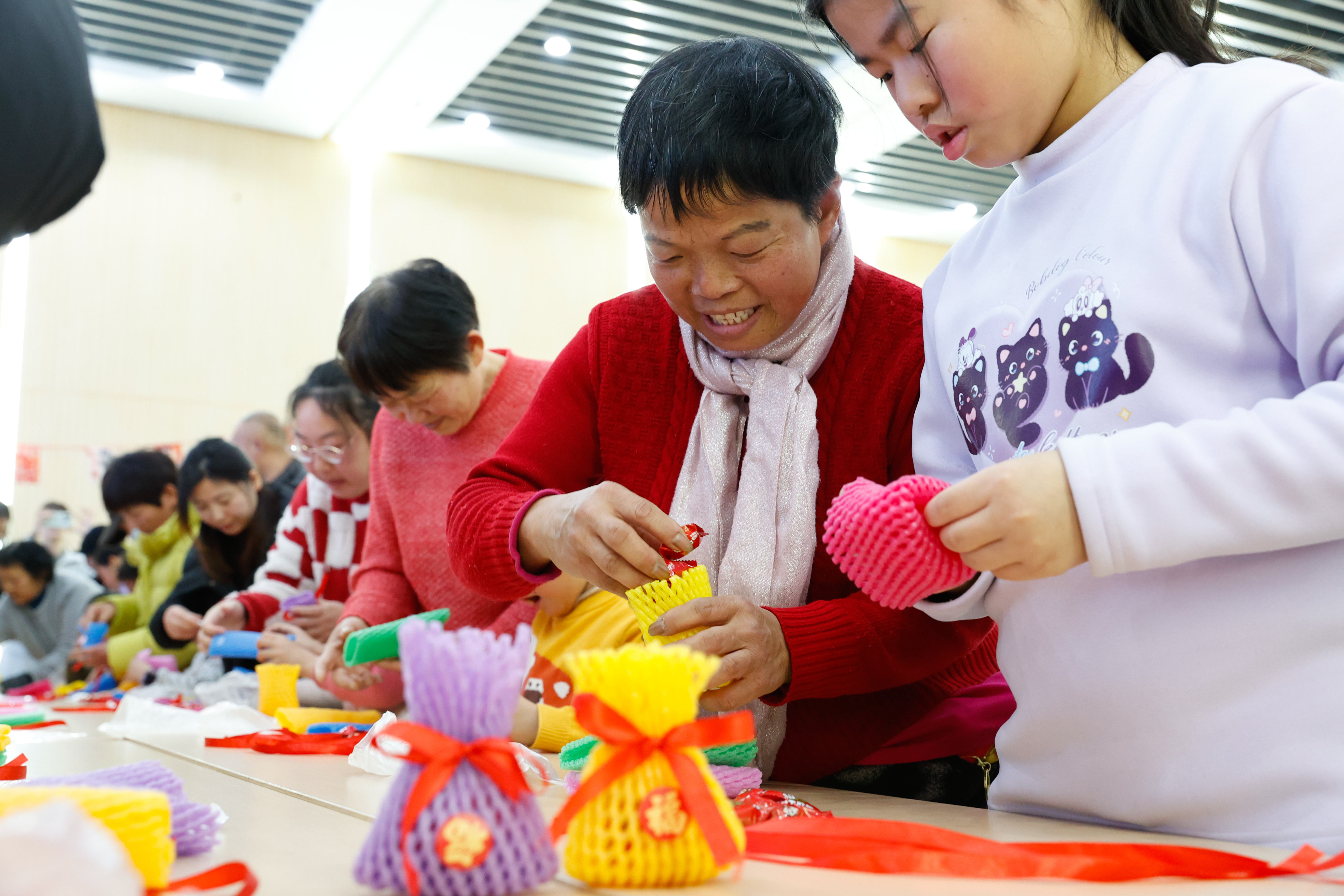 居民在玩“吸福”游戏,将盘子里五个“福”字用吸管吸到另一个盘子里。