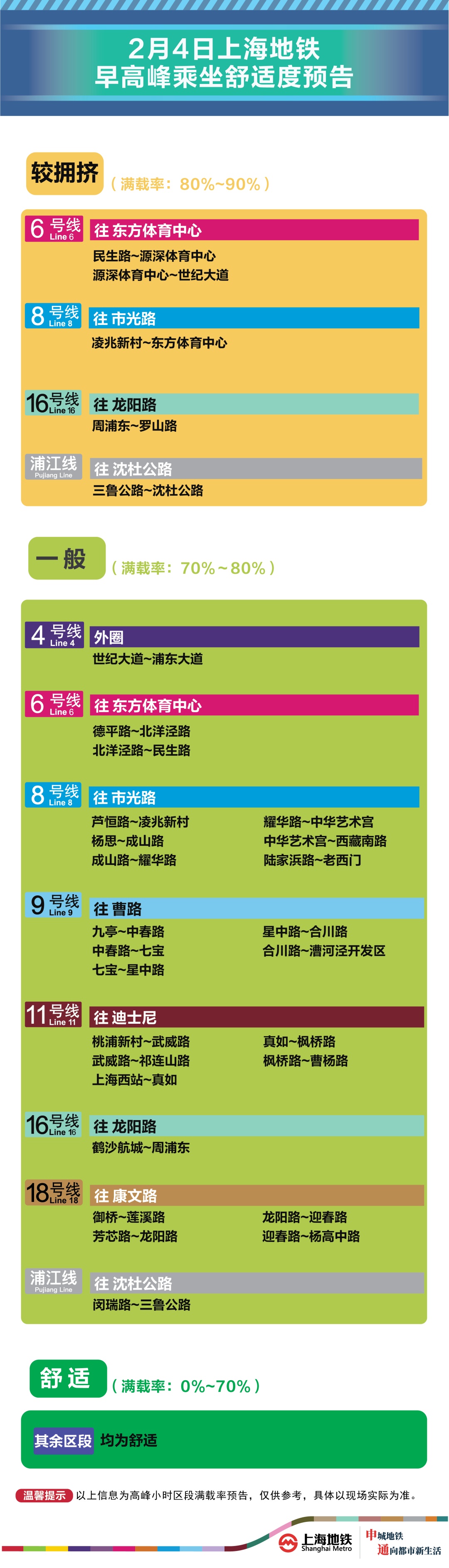 为提升上海地铁早高峰期间出行服务水平,提升乘客乘坐体验,上海地铁向乘客提供乘坐舒适度预告,方便乘客提