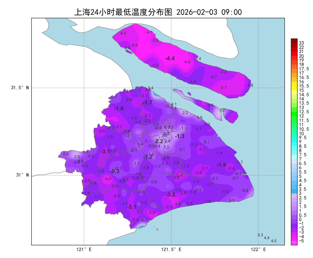 辐射降温作用下,今天(2月3日)早晨又是十足的冷,大部分郊区最低气温在-5℃~0℃之间,上海市区徐家汇站2.2℃。白天上海为晴到多云天气,风力不大,偏东风下午转东南风,风力都是3~4级,最高气温可上升到11℃左右,相对湿度90%~50%,午后温度、湿度都比较适中,体感温暖不少。