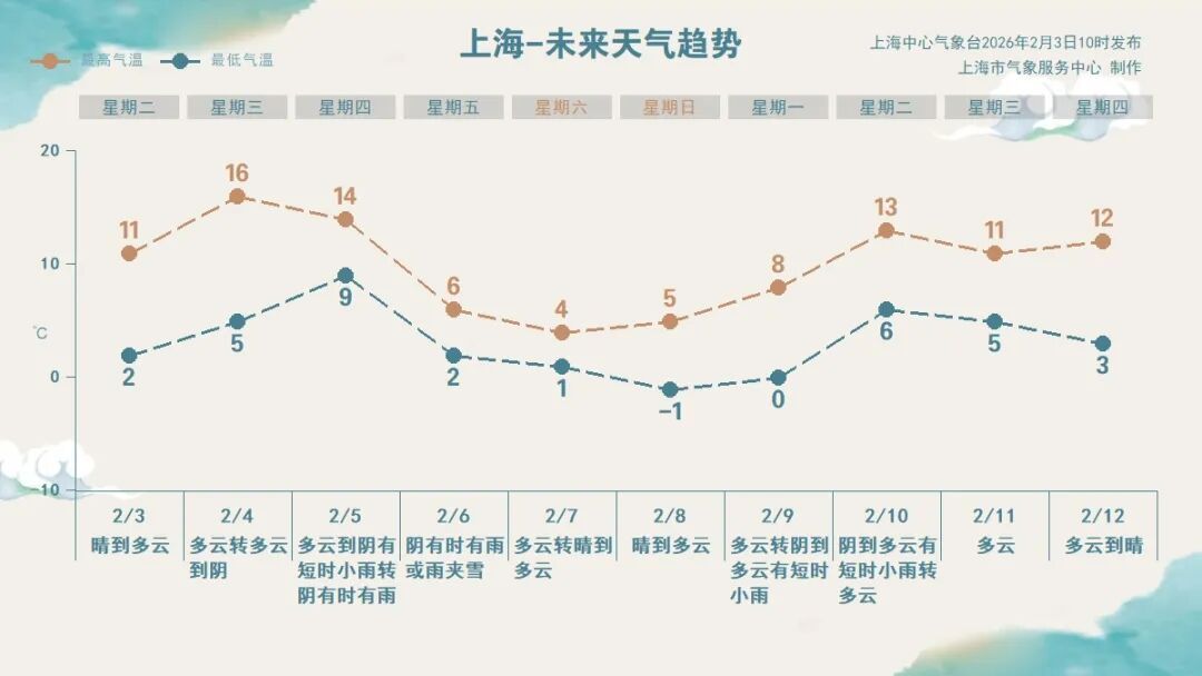 明天进入“立春”节气,白天多云为主,升温明显,最高气温可接近16℃,有可能成为近二十年最暖的“立春”日(2007年2月4日徐家汇站最高气温曾达16.1℃)。周四云系进一步增多,白天偶有短时小雨,气温稍有回落,最高气温在14℃左右。周四夜间起降水变得明显,周五在冷空气影响下,上海市风力大增,气温骤降,全天气温不足6℃,伴随降温还会出现雨雪转换,体感非常湿冷,请及时添加衣物,出行注意交通安全。双休日上海转为晴冷天气,白天最高气温不超过5℃,上海市区最低气温也将跌破0℃,郊区更低。