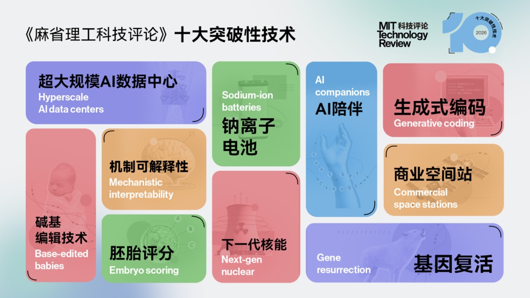 2月1日,《麻省理工科技评论》2026年“十大突破性技术”(TR10)闭门解读分享会在上海闵行举行,会上深度解析了超大规模AI数据中心、钠离子电池、机制可解释性、碱基编辑技术、下一代核能、胚胎评分、AI陪伴、基因复活、商业空间站、生成式编码等在3—5年内影响未来的创新的“十大突破性技术”。 这份榜单清晰地揭示:AI已从单一技术点,跃升为驱动能源、生命科学、太空经济等创新融合的“核心催化剂”。