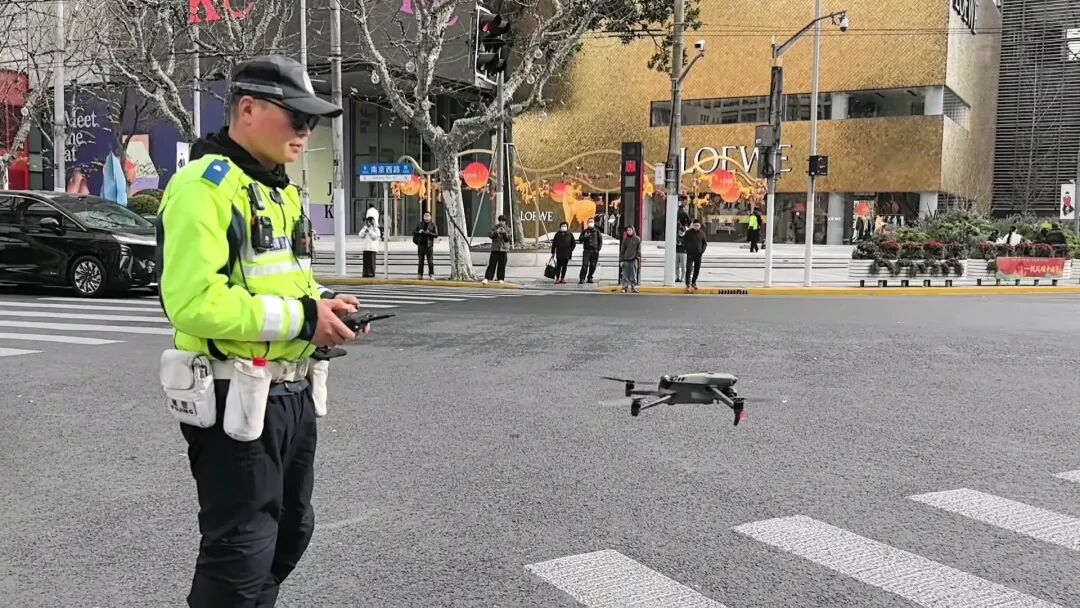 在南京西路常德路路口,静安交警开展专项整治。无人机缓缓升空后,对路口及周边进行全方位巡查,短时间内便精准锁定了3起非机动车闯红灯行为,并完成高清取证。