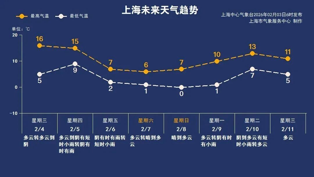 上海中心气象台预计,明后两天天气进一步回暖,最高气温回升到15~16℃。周四天气由晴转雨,白天有短时小雨,夜间到周五白天降水将更明显,在冷空气影响下还将伴有大风和降温。双休日气温骤降至7℃以下,市区最低气温或将触达0℃,郊区全线在0℃以下,届时需注意防寒御冷。