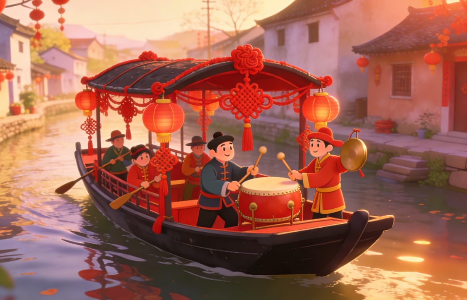 活动还没开始,气氛就先拉满!当天上午10:00至12:00,一艘装饰着红灯笼、中国结的乌篷船将沿着村内河道缓缓而行,船工身着传统服饰,敲锣打鼓绕村,用质朴的方式唤醒乡村年味。记得提前到河边占个好位置,感受这流动的年俗画卷。