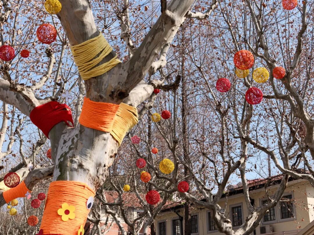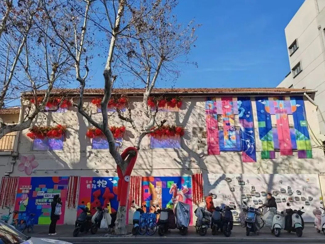 漫步武夷路,处处可见精心设计的节日景致。武夷路305号街道旁的梧桐树干被红、橙、黄三色绕线温柔缠绕,宛如披上喜庆的节日盛装;枝丫间点缀的彩球与花卡随风轻摇,在冬日阳光下闪烁着温暖的光泽。沿街老建筑外墙化身为流动的艺术画廊——337弄墙面上的布艺横幅、抱包装饰与福字绒布相映成趣,蝴蝶结与国潮造型巧妙点缀其间,复古肌理与现代色彩碰撞出独特的海派年味。走进311弄,红底福字与飞天金马挂饰高悬巷弄上方,两侧垂落的红金叶藤条圈营造出浓郁的弄堂年节氛围,让人仿佛穿越时光,重回邻里相亲的温情岁月。
