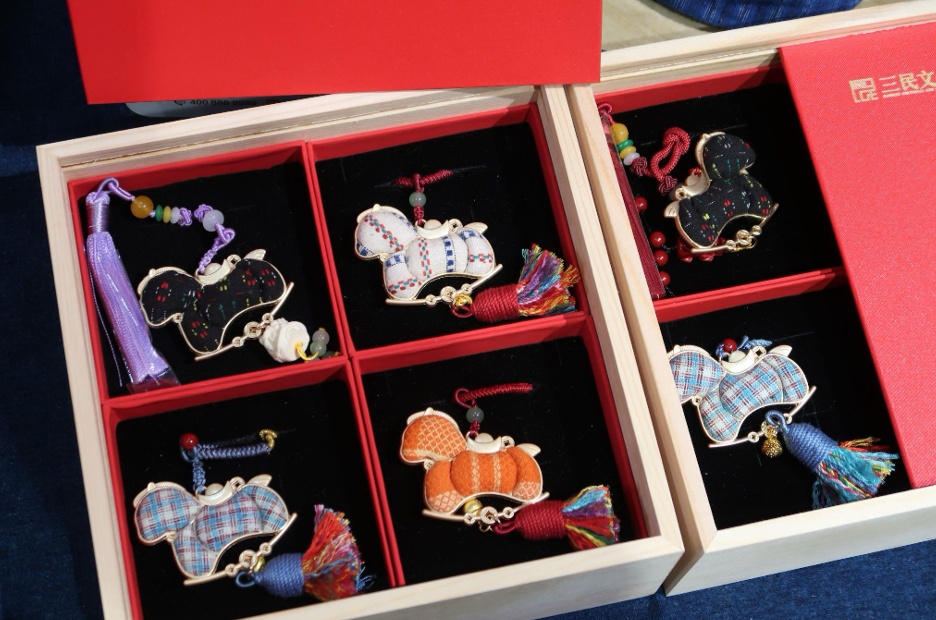 在江南三民文化村,一款“马年送福——崇明非遗四骏礼”礼盒深受年轻消费者喜爱,礼盒中的小马挂饰用四种不同花色的崇明土布制成,造型圆润、背驮金元宝、脚踏铜钱的小马,下方坠以色彩鲜艳的流苏,年轻人将其挂在背包上,行走间轻轻晃动,俏皮而富有灵气。由于土布织造肌理与纹样各不相同,这套挂件的每一匹小马又呈现出独特的面貌,再加以吉祥元素的点缀,让其既保留了土布的质感,又承载了美好的祝愿。