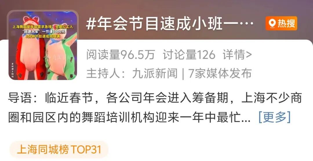 春节将近,又到了年会季。今年,你被要求参加年会表演了吗?此前,我们“职场麻辣烫”也和大家讨论过单位年会让你表演节目,你会嫌烦吗,有超过30%的人认为参与年会表演是一种负担。但也有越来越多人在社交平台上发布自己年会表演的视频,因领导和同事的认可而开心↓舞蹈节目一向是年会节目里的大爆款。最近,上海舞蹈室迎来年会培训订单激增,成了打工人的专属练兵场,团建式的年会节目速成班更是场场排满。相关话题登上上海同城热搜↓据报道,沪上多家舞蹈机构不仅开设定制订单班,还会上门授课,3分钟的年会节目一般3到6课时就能学成。来参训的职场人大多是零基础、水平参差,老师会简化热门舞蹈动作,最快2课时就能拿下一支舞。有机构介绍,常规团课约为每人每节150元,而年会小班课价格为每节800至1000元,1对1课程则为每节600至700元。节目内容方面,网络热梗成为年会舞台“常客”。对此,网友们看法各异:有人觉得编排年会节目,是同事工作之余难得的相处契机,还能放松身心;有人认为这既占工作时间又挤休息时间,让人身心俱疲;还有人直言,参与年会表演更像一场“服从性测试”,但敢怒不敢言…