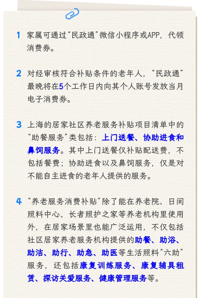 “养老服务消费补贴”除了能在养老院、日间照料中心、长者照护之家等养老机构里使用外,在居家场景里也能广泛运用,不仅包括社区居家养老服务机构提供的助餐、助浴、助洁、助行、助急、助医等生活照料“六助”服务,还包括康复训练服务、康复辅具租赁、探访关爱服务、健康管理服务等。