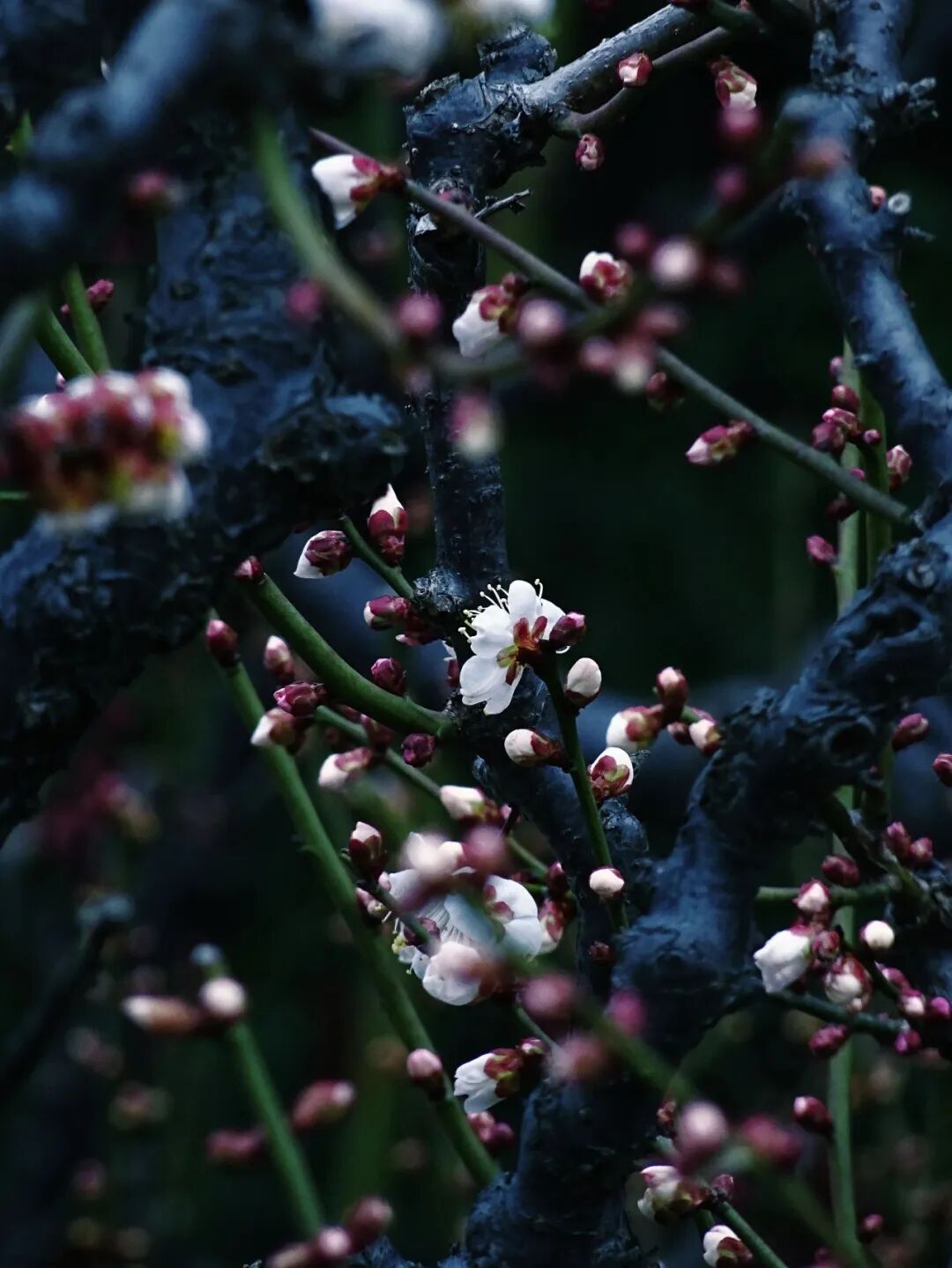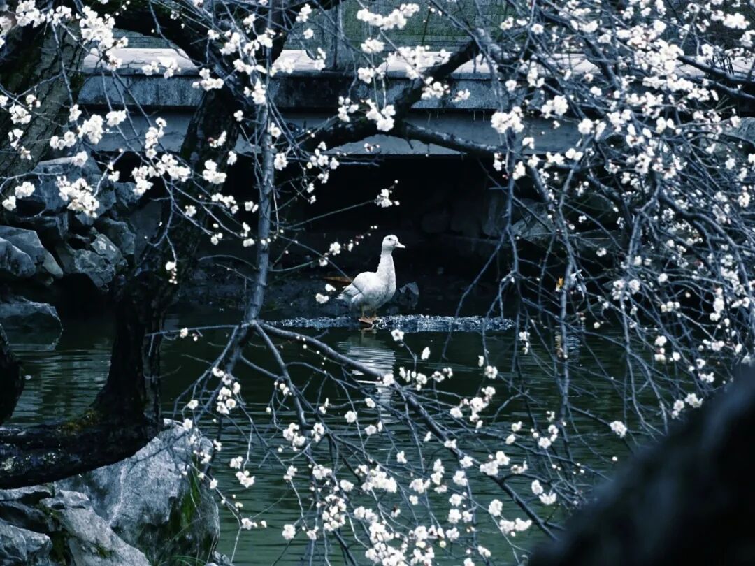 白色的梅花点缀着青绿的湖面,花影、鸭影搅在一起,分不清谁是谁。空气里有股梅花香,淡淡的,混着水汽,从湖面飘来。