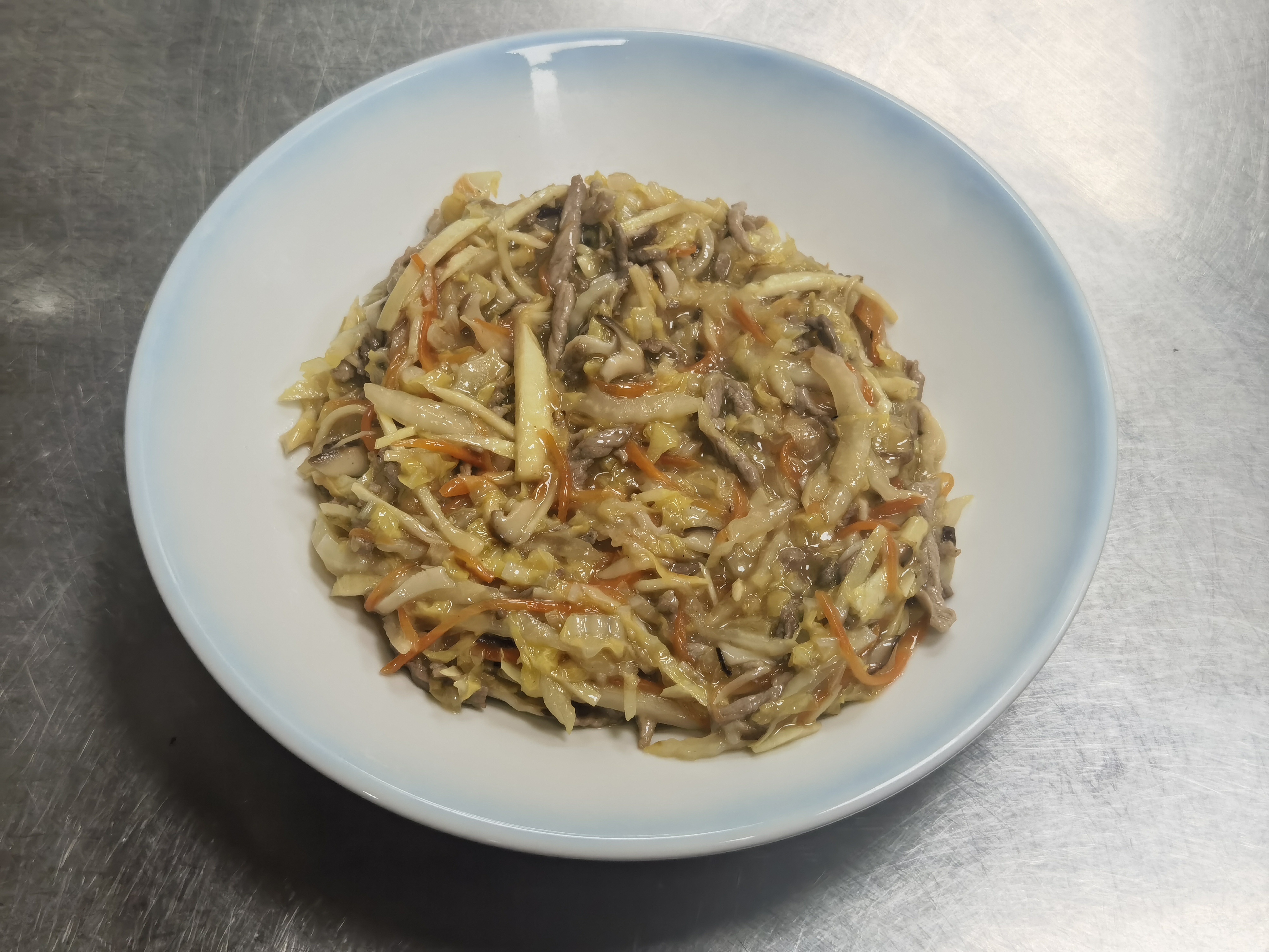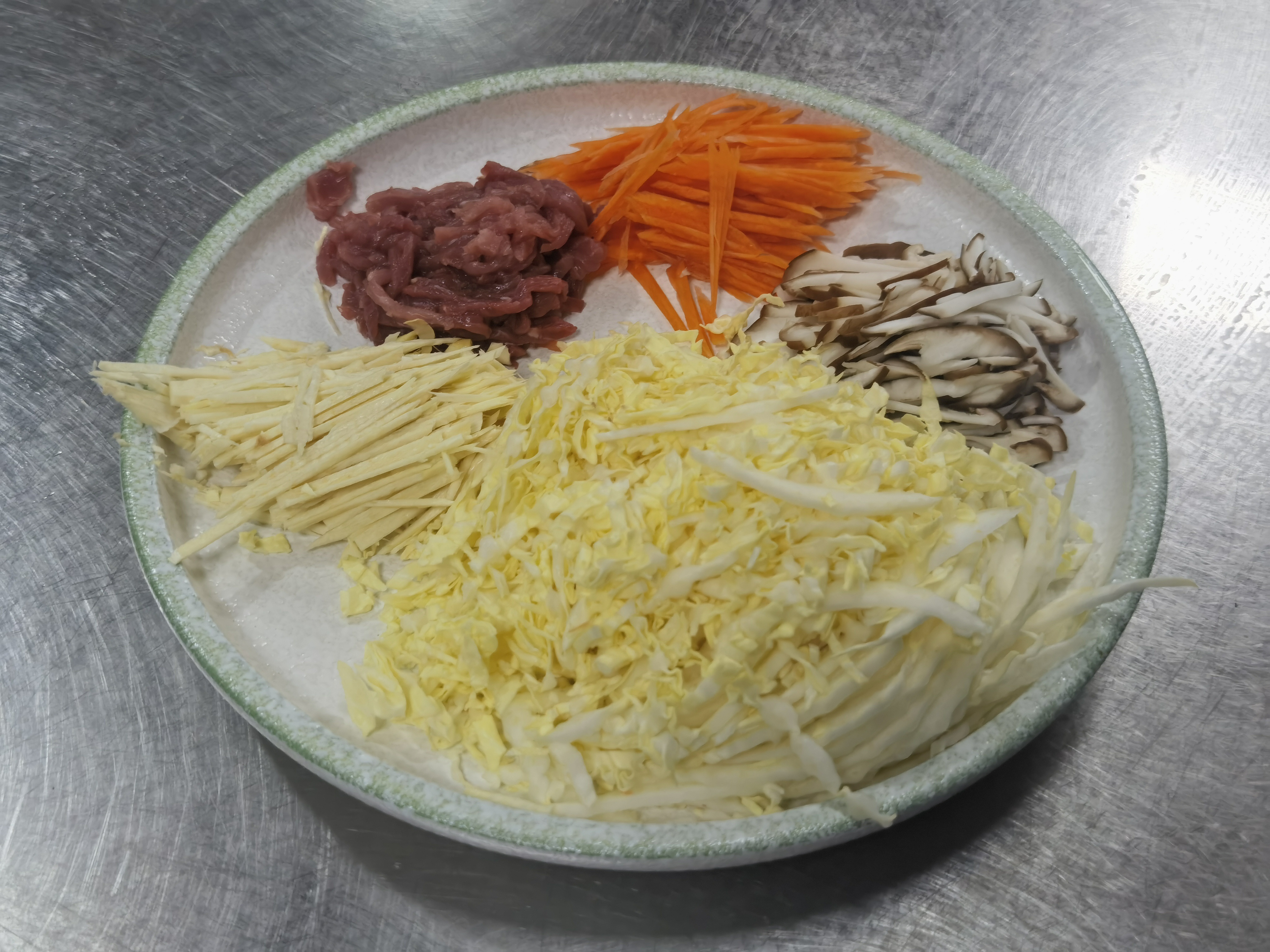 上午10时,记者走进小昆山镇一家餐厅,厨师正在后厨备菜,只见他依次将香菇、胡萝卜、白菜、冬笋和瘦肉切丝,再将素菜放入热锅炒至断生,紧接着加入瘦肉和调味料爆炒,最后倒入生粉汁勾芡收汁即可出锅。“如果不喜欢吃白菜的话,也可以替换成韭黄,反正这两种就是春卷的主要食材。”厨师姜建民介绍。