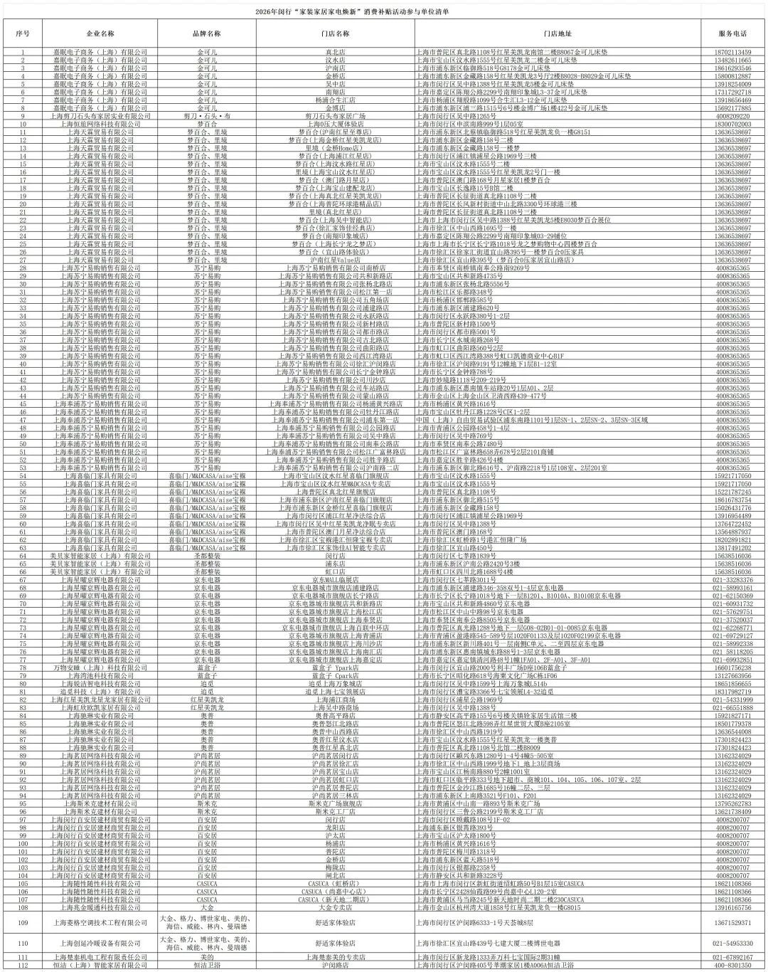 答:消费者可致电参与企业客服电话(通过云闪付App首页—背景图—“闵行家装家居家电焕新消费补贴”专区的参与活动商户页面查询商户电话)