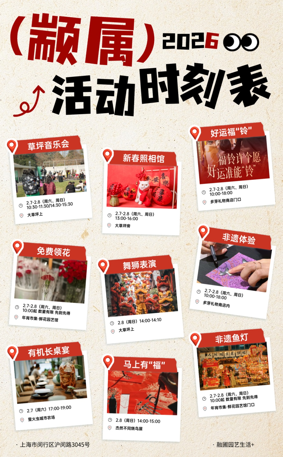 小时候热闹沸腾的年货大集,回来啦! 就在融圃园艺生活+ 绿植花艺、烟火美食、新春好礼 100+摊位满满铺开 谁还说城里过年没年味? ✨ 5大主题片区错落排布 一站式承包你的新春采购清单 甄选特惠年宵花与绿植 集结各类地道年货干货与特色农产品 汇聚手作达人佳作 精选颜值与实用性兼具的新春好礼 一口解锁烟火暖意 循着地图打卡颛桥各个点位 集满印章就能免费领取新春好礼一份 蝴蝶兰、金桔、水仙等各类年宵花 超值特惠来袭! 记好现场演出时间,赴约不慌~ 不妨再一同解锁这份 “颛属”逛吃购指南 好物、美食、惊喜一站式拉满 稳稳承包你的新春满满年味 爱月花园 爱月花园主营各式年宵花,爆款年宵抱抱桶、绿植盆栽、清雅水仙一应俱全,花材新鲜、款式丰富,为家居与新春送礼添满年味。 云花花铺 云花花铺,上海最大鲜花基地!海量平价年宵花直供,蝴蝶兰、冬青等爆款齐全,鲜度拉满,年味到家。 ChenCT ChenCT是专注小众精品多肉的园艺IP,拥有十余年培育经验,主打实生十二卷选育,兼顾大戟、厚敦菊与特色沙生植物,以新品种引进、杂交选育、品相优选为特色。 如东美食 文蛤饼鲜醇多汁、虾饼酥香浓郁、肉圆软糯弹牙。现做现煎,海味与家常味兼备,是小吃、宴客、年节送礼的地道选择。 安徽风物 徽州风物来袭!非遗米酒醇柔、臭鳜鱼闻臭吃香、火腿腊味醇厚、腊排骨鲜香、干桂花清甜、花生糖酥香,一口尝遍皖南烟火与匠心。 虹桥素食 精选多款中式素食糕点,坚持天然原料、传统工艺,无添加更健康,层次丰富、甜咸兼顾,是节庆送礼、商务伴手、家庭分享的雅致之选。 吉吉巷桶蒸糕 吉吉巷桶蒸糕,上海闵行非遗老味!三代手作杉木蒸,核桃蜜枣红糖层,软糯不粘牙,新春步步“糕”升。 芝子文创 “笔墨映初心,铃声唤本真”的核心理念,坚守“传统文化与自然肌理共同滋养生活”的创作准则。保留书法艺术的清净庄严与人文温度,赋予其符合审美的现代表达。 绒珠雅饰 融非遗绒花之灵秀,汇天然珍珠之温润,专研高品质国风饰品。绒花纯手工打造,非遗技艺复刻东方韵味;珍珠严选优材,莹润质感凸显不俗格调。件件精工细作,质感卓然,让传统美学与精致穿搭完美相融。 春·夏·秋·冬 春夏秋冬是一个根植于自然节律的生活品牌,灵感源自“春生、夏长、秋收、冬藏”的四季哲学。我们相信,自然不仅是生命的源头,也是忙碌现代人重获平静与力量的归处。 Ms Guo 心灵饰品 Ms Guo由心理工作者郭女士创立,将心理学与手作艺术结合,为知性女性打造蕴含积极心理暗示的典雅饰品。品牌旨在通过每日佩戴,于美学中潜移默化地提供心灵疗愈与内在赋能。 不能吃的真面包 网红面包文创专属摊位,真面包制成的挂件、可爱配饰萌感拉满,包上挂碱水,新春顺风顺水。 线上抢先云逛年宵市集 剩余年味惊喜等你现场打卡解锁! ✨ 左手年货,右手好礼 才是赶年宵最惬意的模样 收好这份年宵市集打卡攻略 ↓↓↓ ①游玩动线建议:先逛“鲜花园艺馆”挑花添喜讨个新年好彩头,再前往“年味食集馆”置办新春特色年货,接着到“文创手作馆”挑选趣味匠心手作,随后走进“新春礼赠馆”精选心意年礼,最后以“烟火美食街”的烟火小吃圆满收尾。 ②鲜花园艺馆内设有互动打卡点位,可以免费领取鲜切花束一支;新春礼赠馆门口设有【好运福“铃”】打卡点;大草坪上有音乐会、新春照相馆、舞狮表演等。 ③融圃园艺生活+是花园式园区,设有宠物友好设施和休憩区,可携宠前往,拍照打卡超出片; ④建议穿舒适鞋子,慢慢逛遍所有摊位; ⑤部分非遗手作和花艺产品数量有限,喜欢可及时入手; ⑥不要错过2月8日市集期间的舞狮表演秀、新春送福字! 金颛迎新季·“颛属”年宵市集 门票 免费