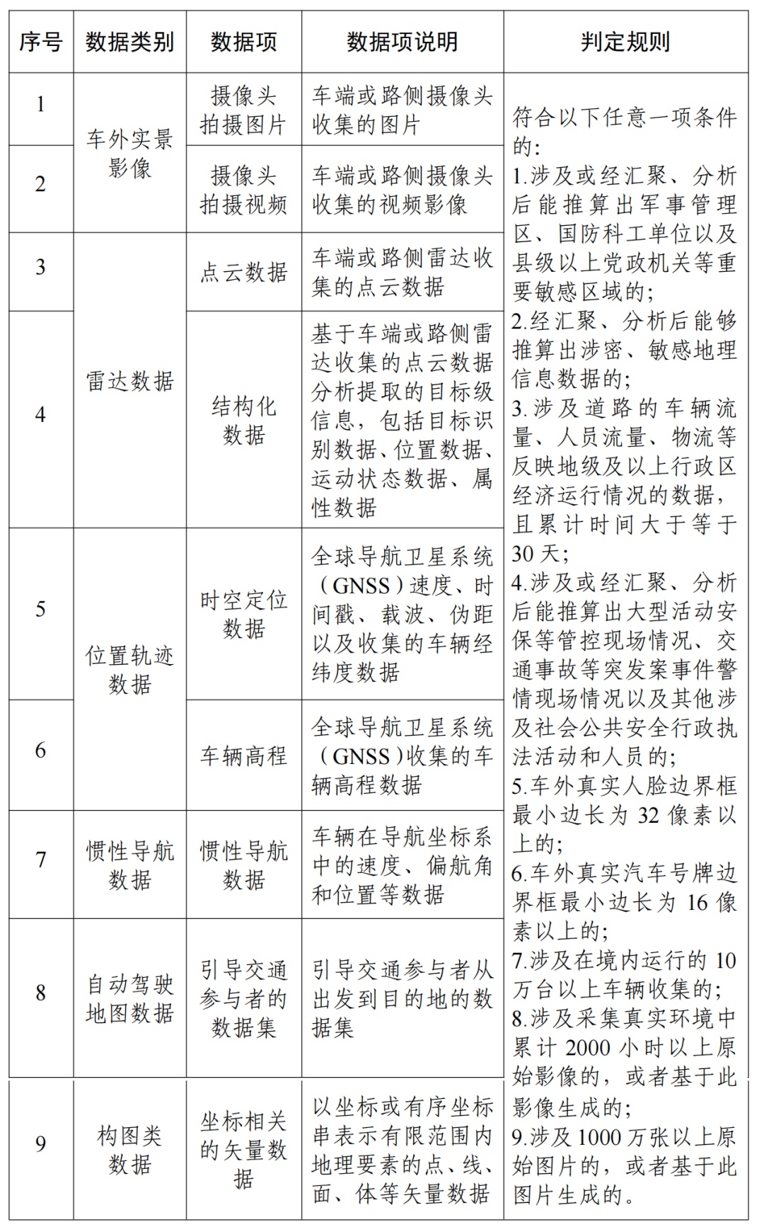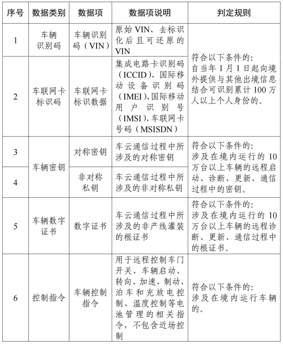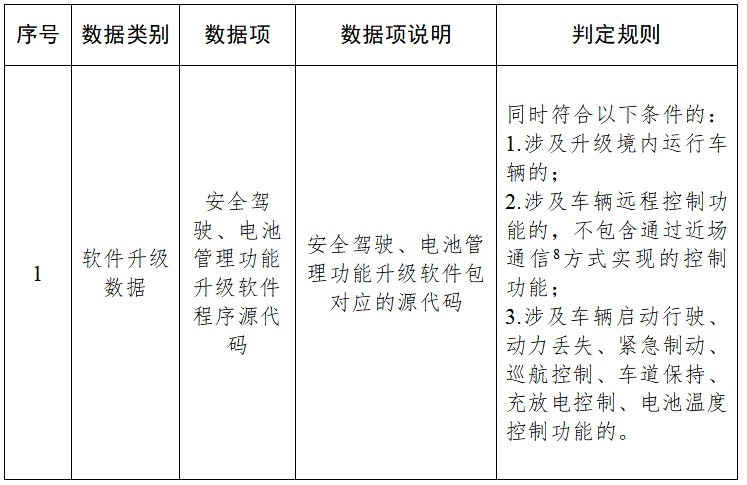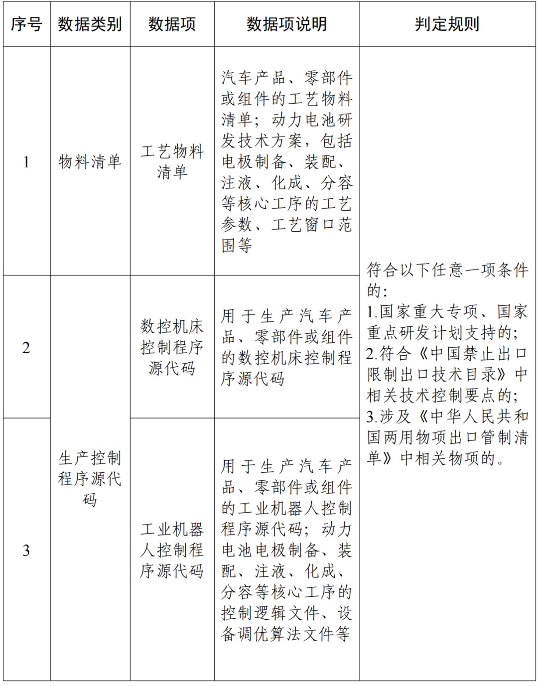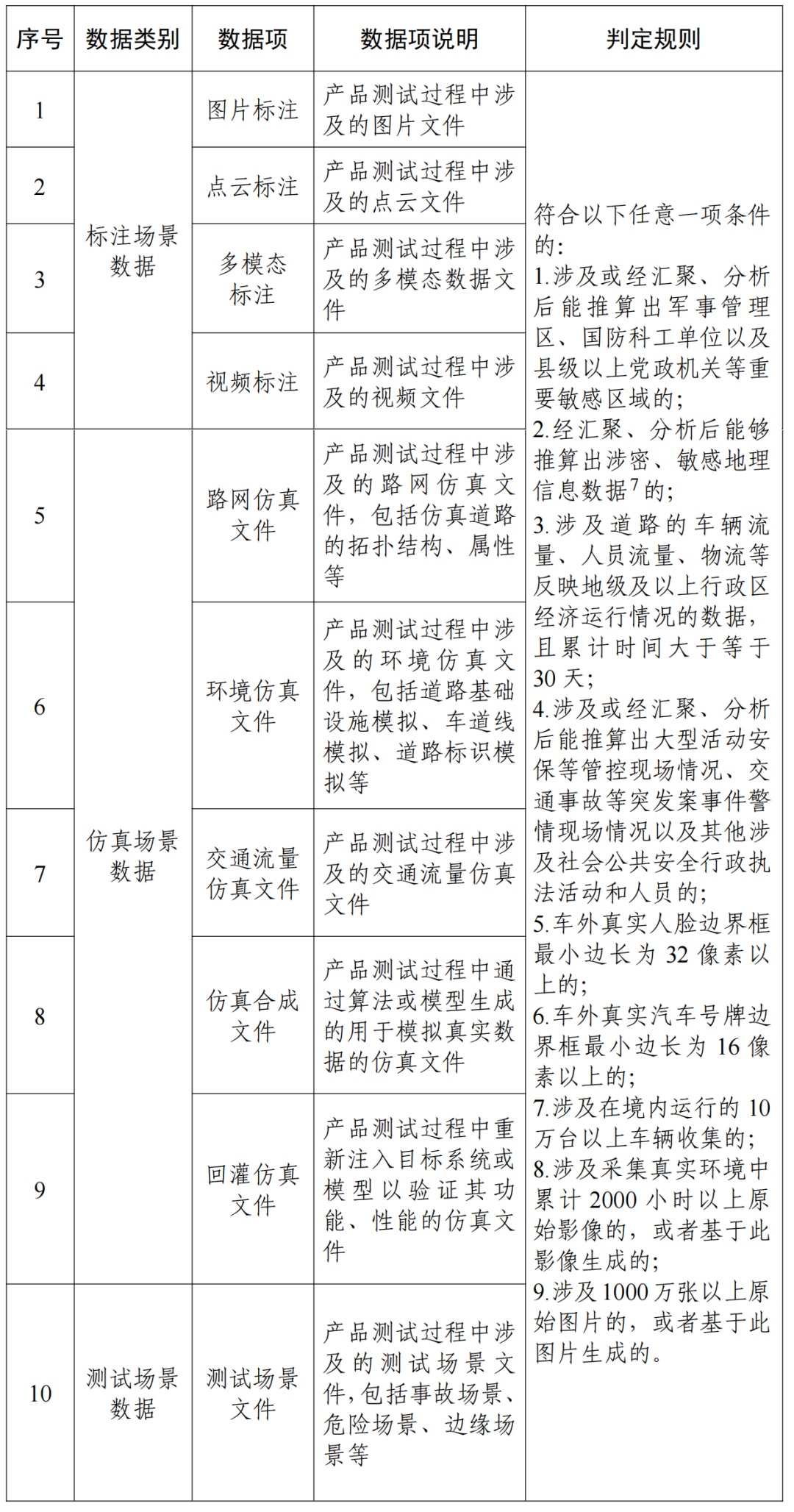 二是重要数据判定,面向研发设计、生产制造、驾驶自动化、软件升级、联网运行等汽车行业典型业务场景,细化汽车重要数据判定规则。