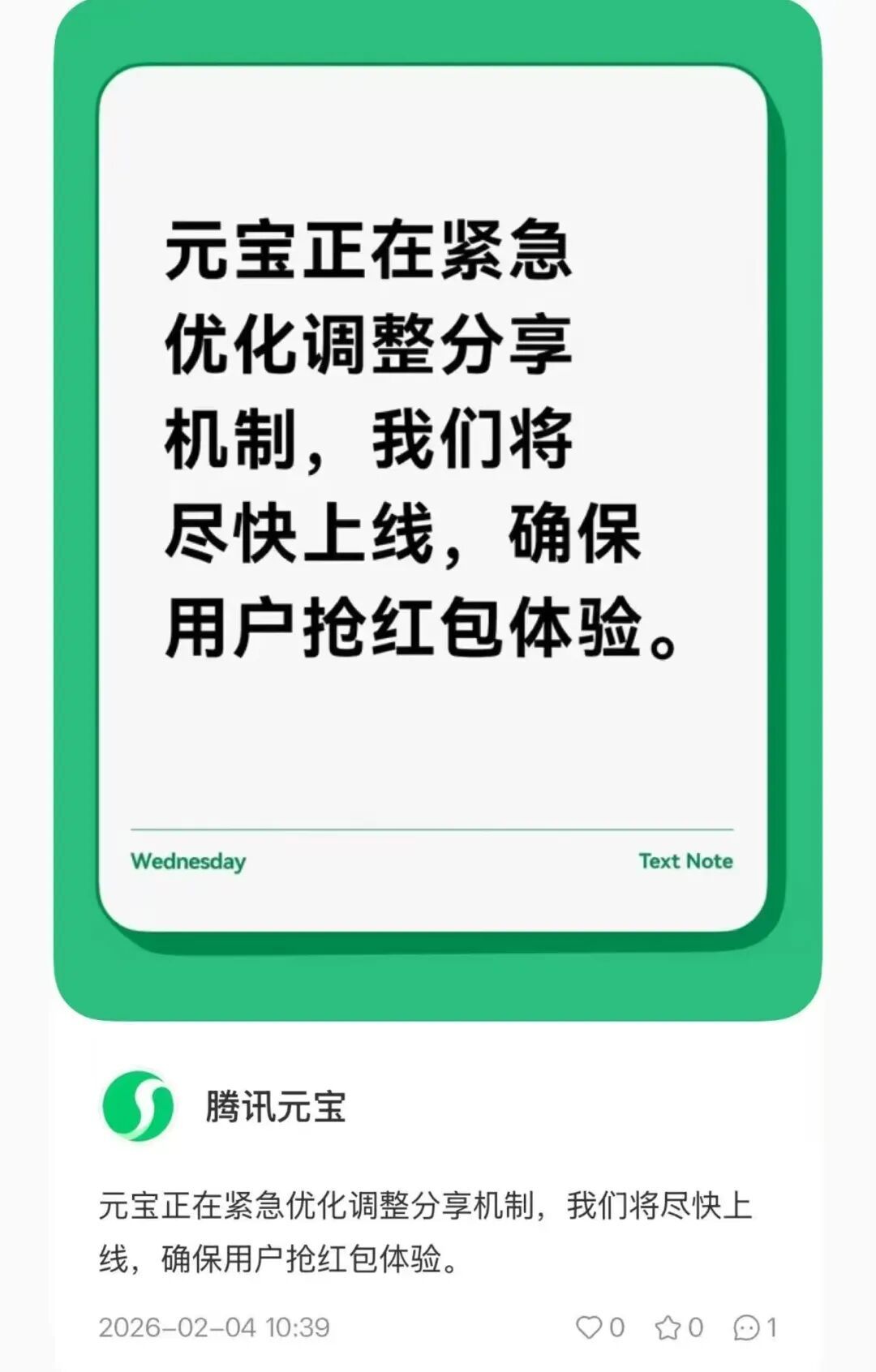 据此前报道,1月25日,腾讯官方发布《关于春节分10亿现金的通知》,自2月1日起,用户将元宝App更新到最新的2.55.0以上版本,点击主页的预约卡片进入春节会场预约页面,可额外获得10次抽奖次数,单个红包金额可达万元。并且,活动设置了万元小马卡、现金红包和分享红包等红包形态,用户每天都有一次领取机会,通过做任务可抽更多红包,也可分享红包支持转发给微信、QQ好友和社群,好友拆红包。