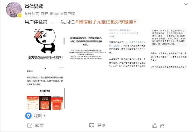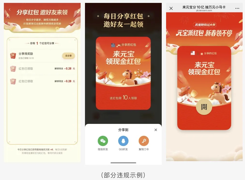 微信收到用户针对元宝的反馈和投诉,其相关春节营销活动存在通过“做任务”“领红包”等方式诱导用户高频分享链接到微信群等场景,干扰平台生态秩序、影响用户体验、对用户造成骚扰。经研判,对元宝的违规链接进行处置,限制其在微信内直接打开。相关处置措施即日生效。