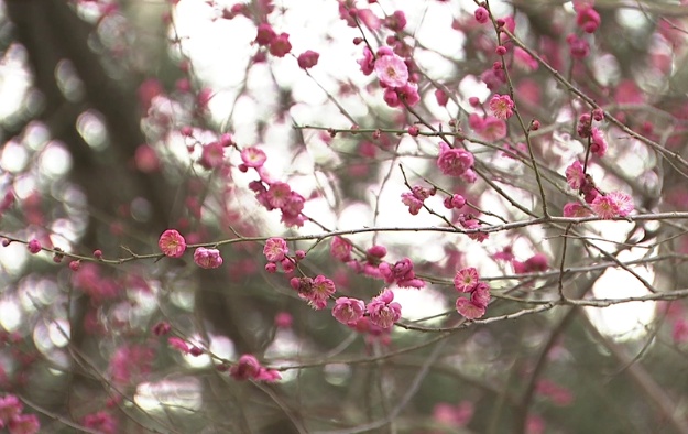 崇明瀛洲公园里的梅花初绽,春意渐显。