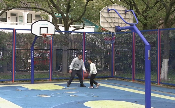 在园内的篮球场上打篮球锻炼身体,