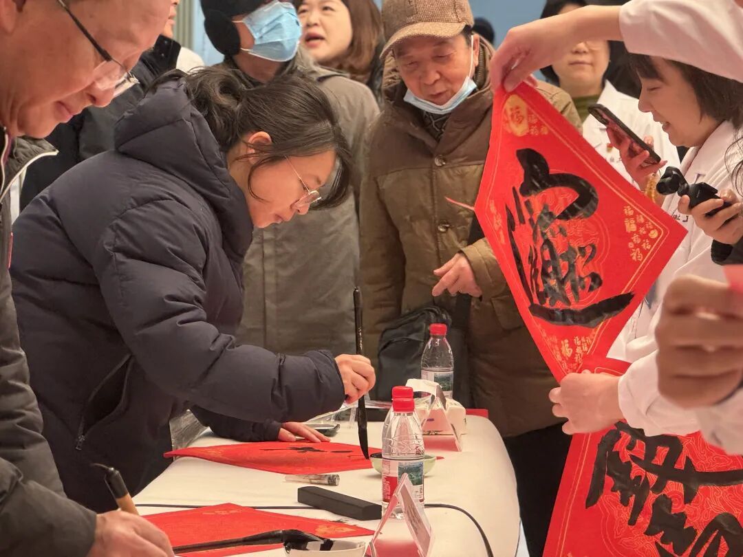 除了寓意美好的福字,书法家们还围绕“健康相伴”“新春纳福”等老百姓关心的主题精心创作春联,兼具传统文化韵味与医疗关怀温度。过往的居民、坚守岗位的医护人员纷纷驻足欣赏,大家互动频繁、热议称赞,现场暖意融融。不少居民捧着刚领到的福字和春联,脸上笑开了花,满心欢喜。