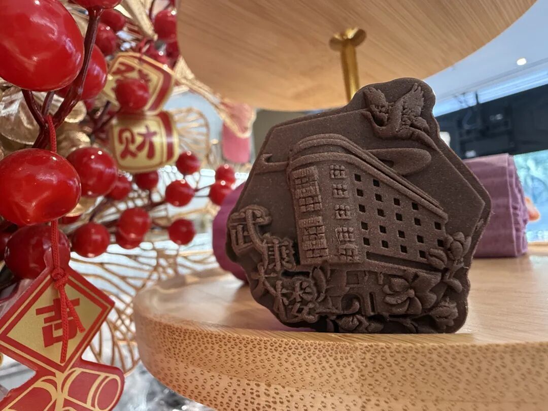 • 武康大楼款:深可可色糕体呼应建筑的红砖外墙,浮雕精准还原其标志性的弧形转角与法式窗棂。内馅精选可可、蜜柚、沙棘与枸杞配伍,沙棘健脾消食、活血散瘀,枸杞滋补肝肾、益精明目,二者协同作用,缓解现代都市人的用眼疲劳与消化困扰。