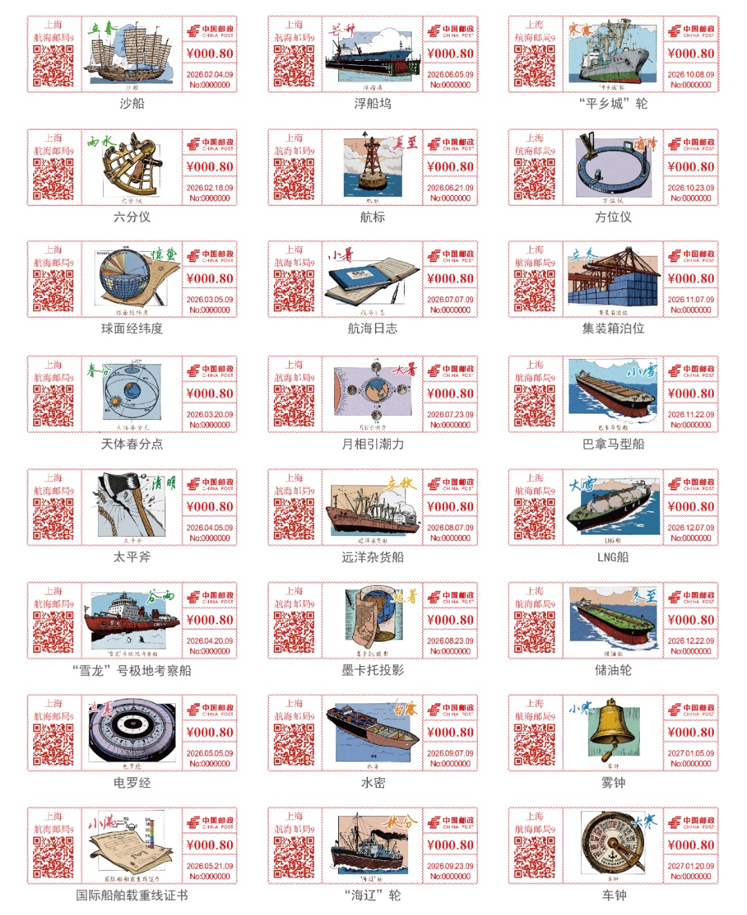 据了解,“二十四节气-航海篇”系列彩色邮资机戳自2026年2月4日起至2027年1月20日共发行24枚,每枚对应一个节气和航海元素,按春绿、夏红、秋橙、冬蓝,每季均有专属色系。机戳的戳面信息包含了中国邮政标识、邮资、时间、编号、地理机构信息,同时配有二维码和可视化唯一码,链接音频、视频故事,打造交互式、多场景的航运文化阅读体验。