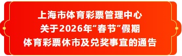 根据《财政部关于2026年彩票市场休市安排的公告》(财政部公告2025年第14号),体育彩票2026年春节休市时间为2月14日(周六)0:00至2月23日(周一)24:00。休市期间,除即开型彩票外,停止全国其他各类彩票游戏的销售、开奖和兑奖。现对上海市春节期间的体育彩票休市及兑奖事宜作如下安排: