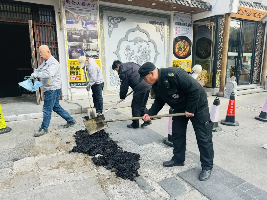 记者再次来到绿地乐和城商业广场内看到,物业工作人员已将路面破损严重的区域围住,设置警示标识。施工人员正有序作业,先清理路面碎石与尘土,确保基层稳固,随后将沥青冷补料填补在坑洞内,敲打夯实,以保证路面平整。物业负责人告诉记者,此次维修优先处理破损严重和人流量密集的区域,避免雨天积水和夜间通行风险。