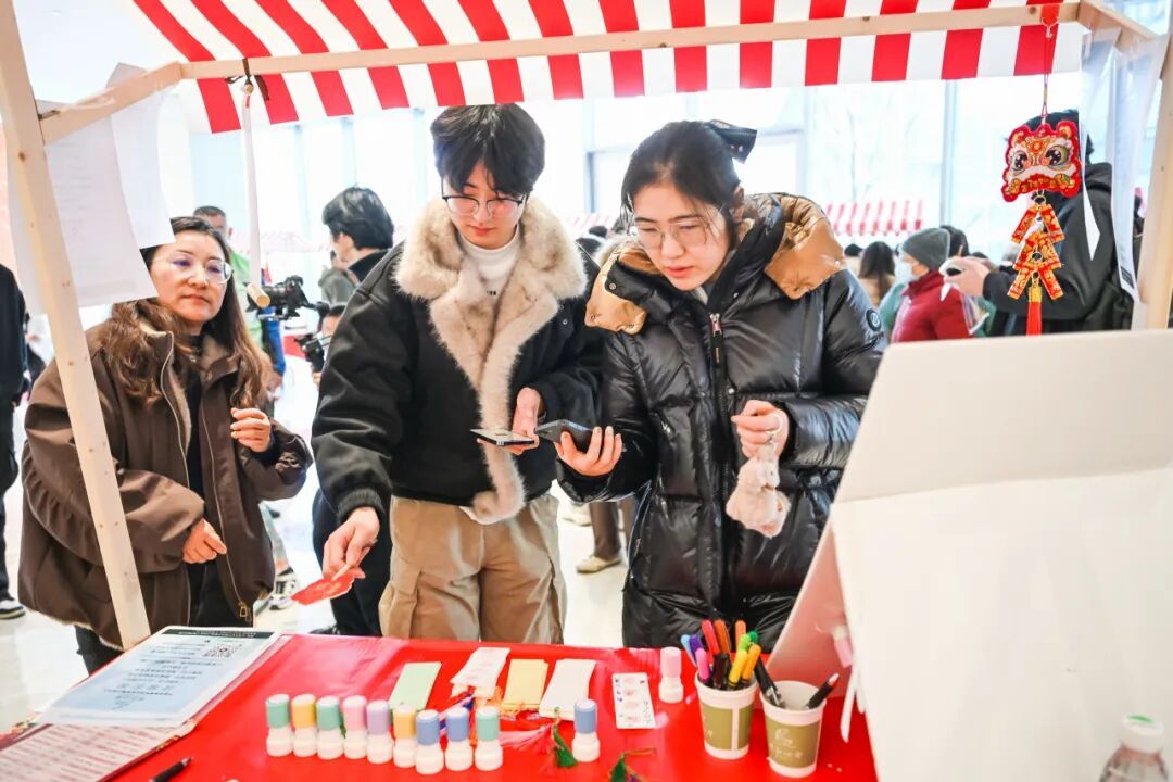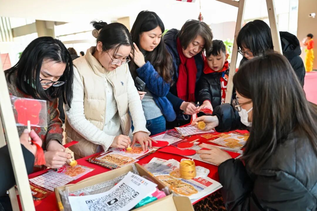 在“马上有福”国潮非遗体验区,墨香与欢笑交织成最动人的年味儿。楹联送福摊位前,书法老师们笔走龙蛇,隶书的庄重、楷书的规整、行书的洒脱,一副副“龙马精神”“马到成功”的春联与红彤彤的福字新鲜出炉,居民们手持墨宝,脸上洋溢着幸福的笑容;非遗拓印、龙凤字体验区排起了长队,大人小孩亲手操作,将吉祥纹样拓印成型,把自己的姓名化作龙凤呈祥的艺术字体,在指尖感受传统技艺的精妙;糖画、捏面人摊位前更是人气爆棚,老师傅手法娴熟,融化的糖丝转眼变成奔腾的骏马、灵动的瑞狮,彩色面团捏出栩栩如生的生肖马、可爱的卡通形象,每一件作品都成为孩子们爱不释手的新春礼物;文创DIY区域内,居民们发挥创意,亲手制作专属新春文创,在动手实践中沉浸式感受传统文化的魅力。
