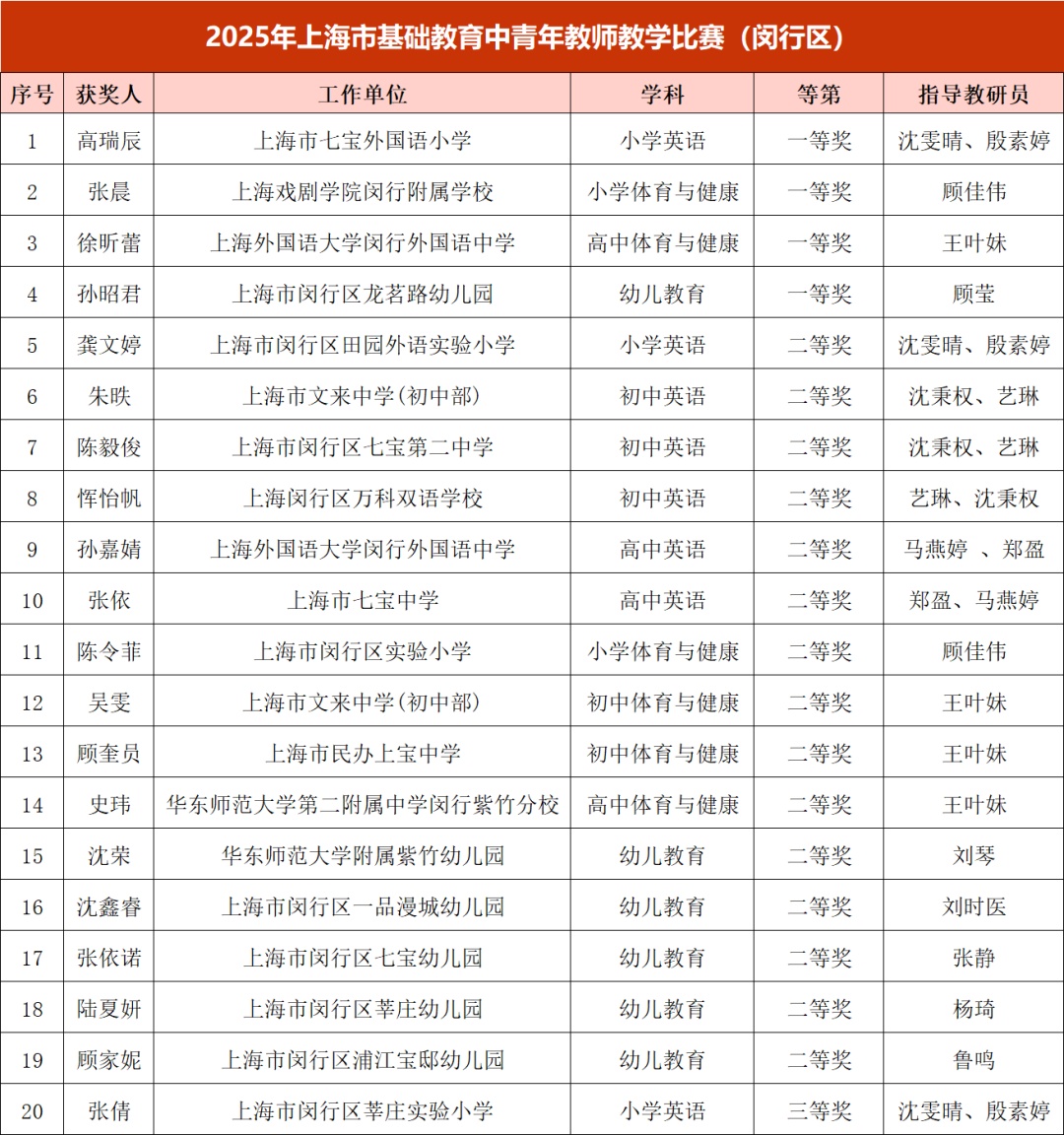 日前,2025年上海市基础教育中青年教师教学比赛结果揭晓。在这个被誉为上海基础教育界的“奥运会”比赛中,闵行教师表现优异,共有20位教师脱颖而出,其中4位教师斩获一等奖,15位教师获二等奖,1位老师获三等奖!