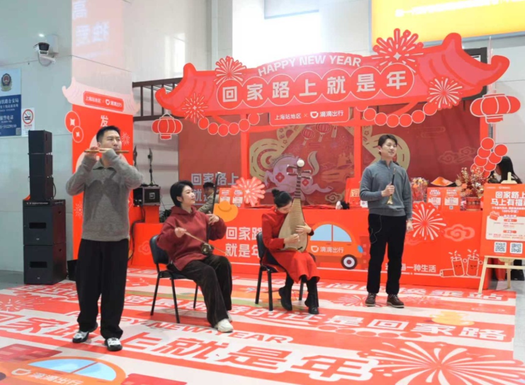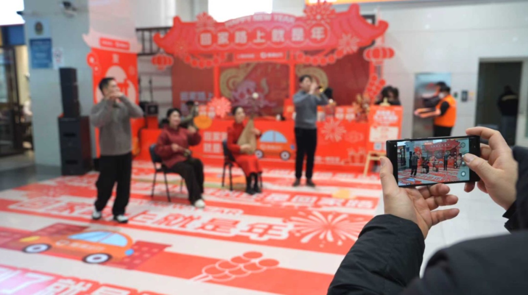 便捷的同时,年味也不缺席。春运期间,上海站“音乐伴你行”民族乐快闪活动限时上演。演奏者用二胡、唢呐等民族乐器,演绎《喜洋洋》《步步高》等经典曲目,欢乐的旋律在候车大厅回荡,瞬间拉满节日氛围。不少旅客停下脚步,拍照留念。