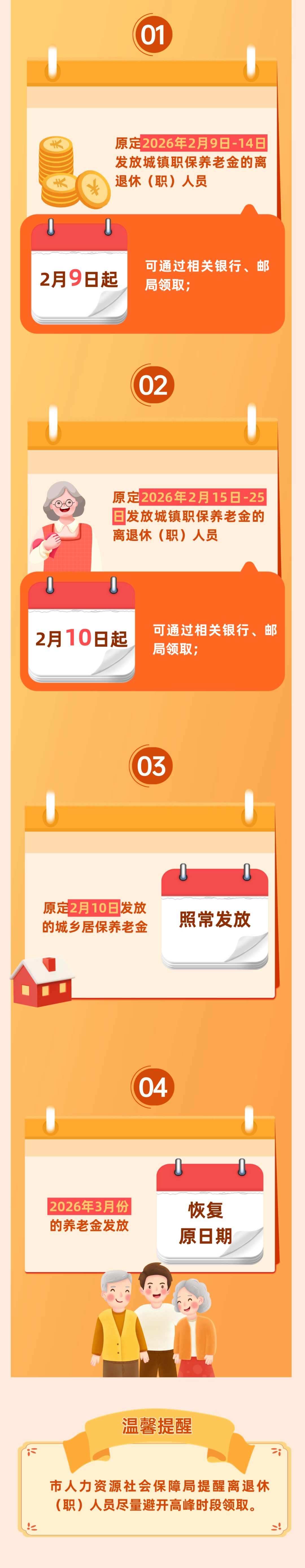 2026年2月15日至23日恰逢春节长假,市人社局将对春节长假期间发放的离退休(职)人员养老金提前发放。具体安排如下↓