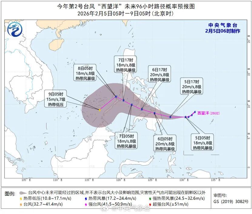 据中央气象台,今年第2号台风“西望洋”(热带风暴级;英文名称:Penha;名字来源:中国澳门;名称意义:西望洋山,澳门新八景之一)已于2月4日晚上在菲律宾以东洋面生成。