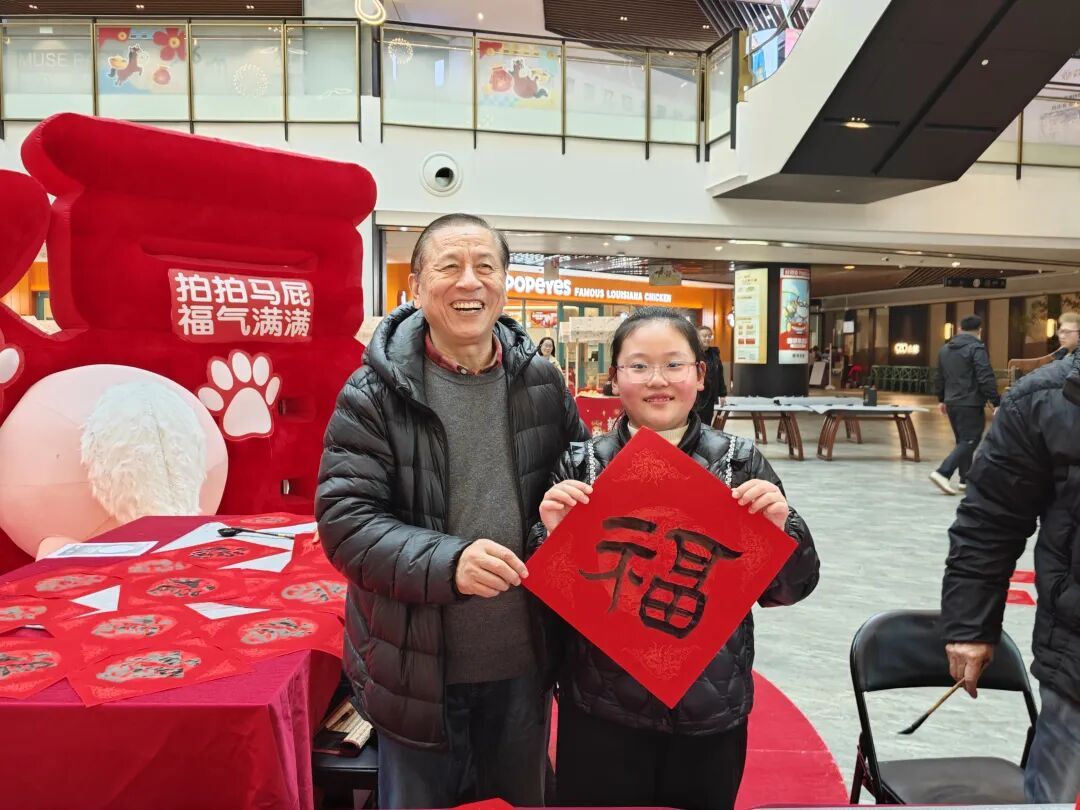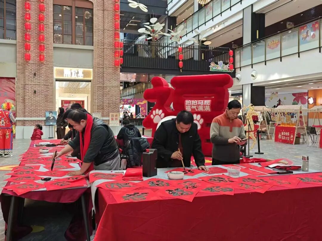 作为民俗文化节首日的核心环节,“书法送福”活动成为了全场焦点。活动特别邀请了五位书法名家现场挥毫。墨香四溢中,一幅幅寓意吉祥的春联和“福”字随笔尖诞生,商场负责人也为各商家送上“福”字和美好祝愿。