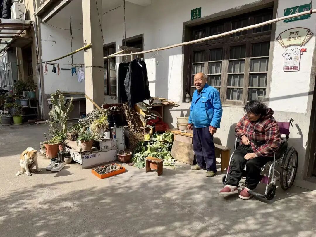 苏民村村委会东边,一栋老旧的二层小楼是周曙明的家。斑驳的白墙下,常有邻居聚在小院里晒太阳、聊天。记者采访当天,遇到74岁的邻居张爷爷推着轮椅而来,轮椅上坐着他的妻子。