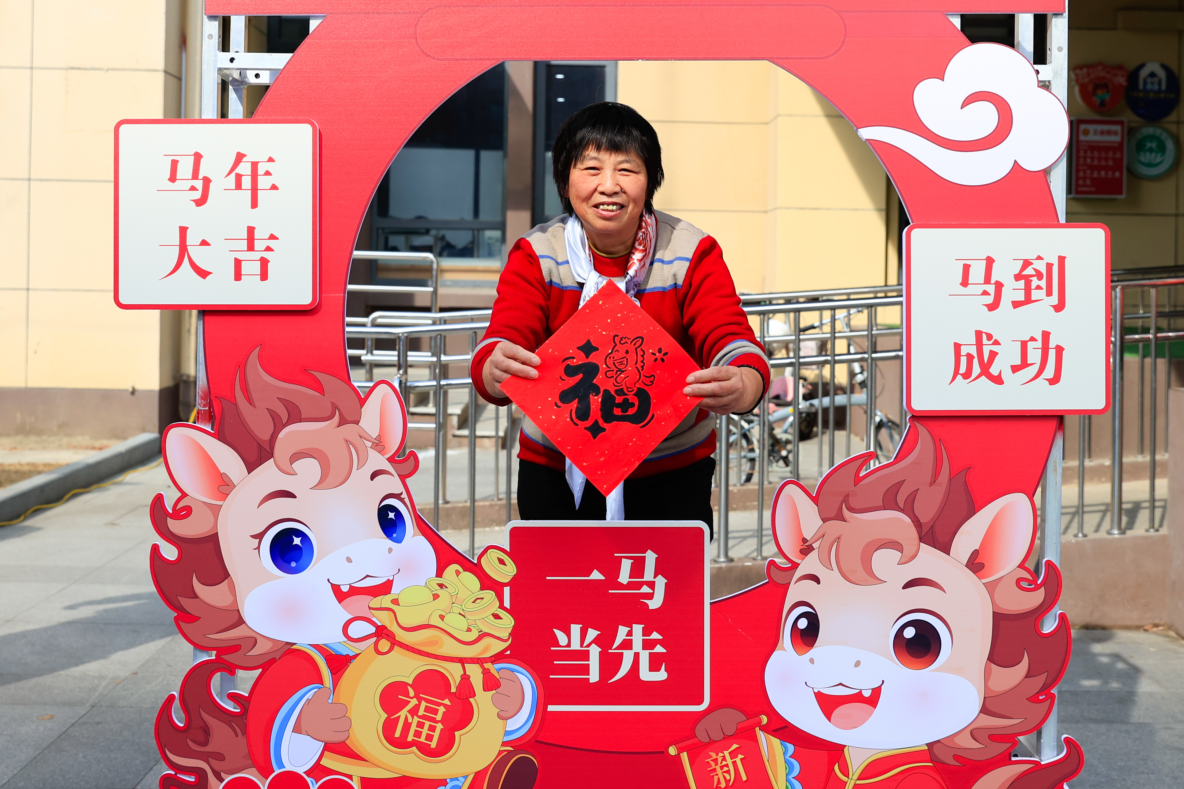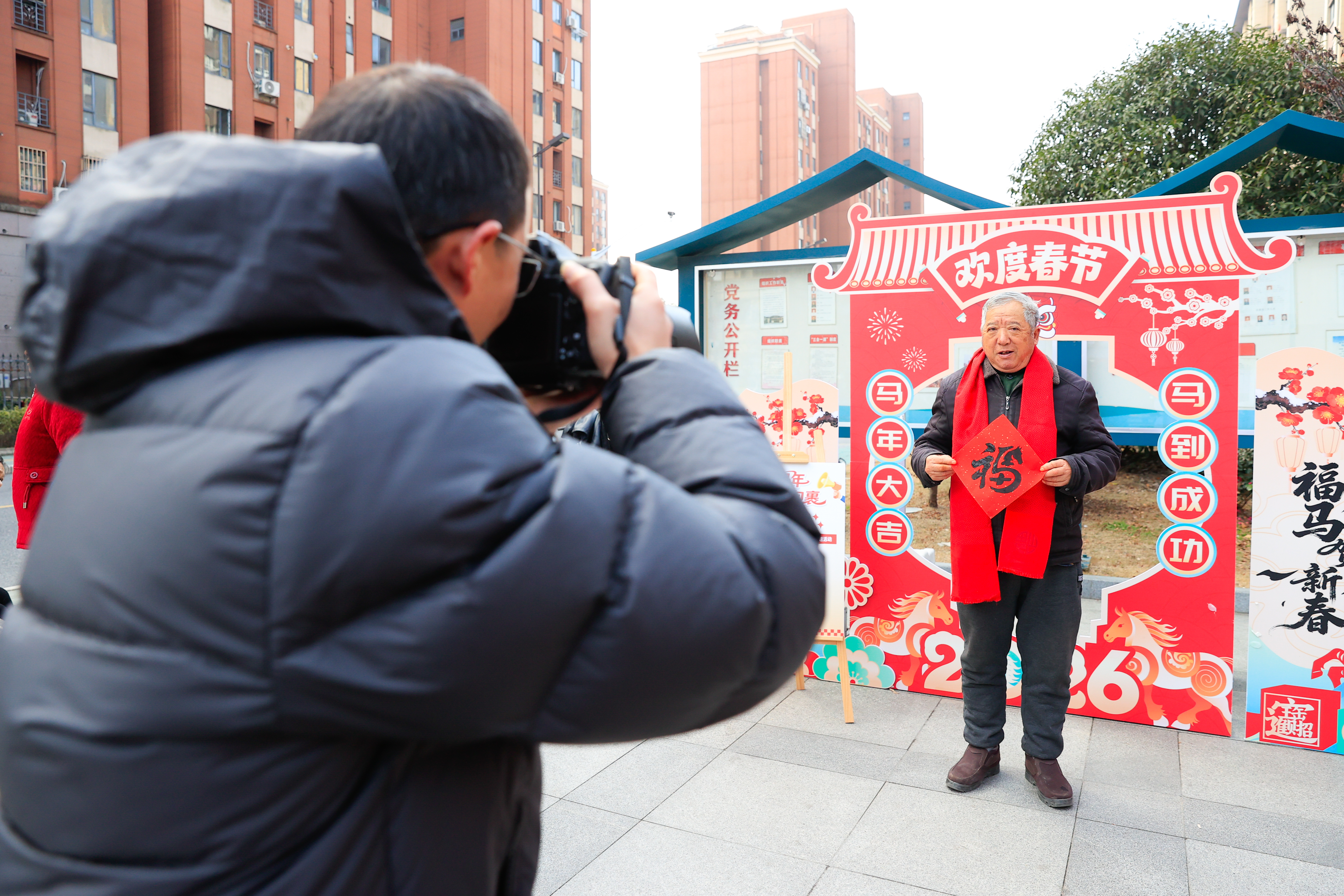老人拍摄新春照片。