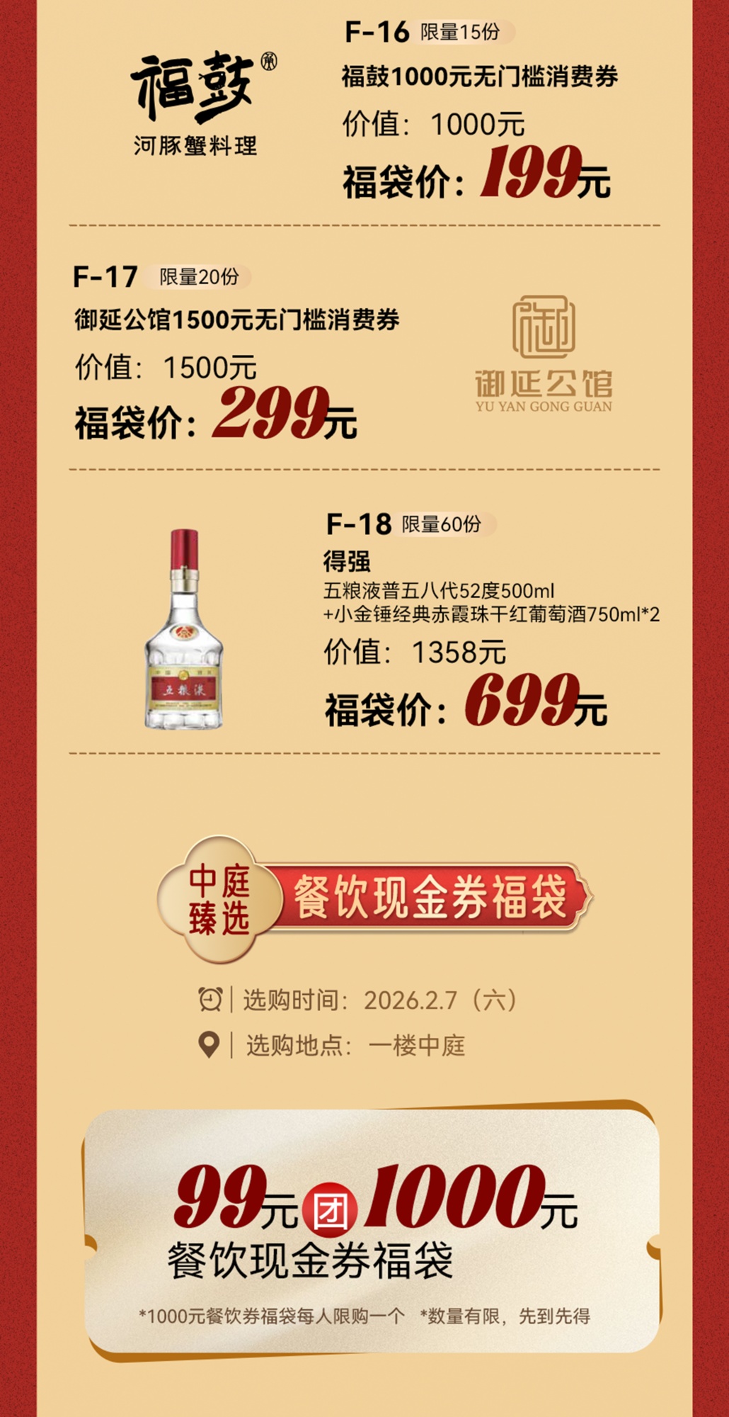 全品类折扣与消费补贴同步上线,进一步放大消费实惠。2月7日10:00起,2025年度有消费记录的会员到店可领取800元黄金珠宝消费补贴资格券,限量500张,B1F黄金珠宝类商品消费满8000元可直接抵扣使用;同时,消费者可通过商场微店抢购50元购100元餐饮消费券,可在大神太神、福鼓、阳坊涮肉、御延公馆、映水芙蓉、拾神山外等多家热门餐饮品牌使用,解锁舌尖上的实惠。