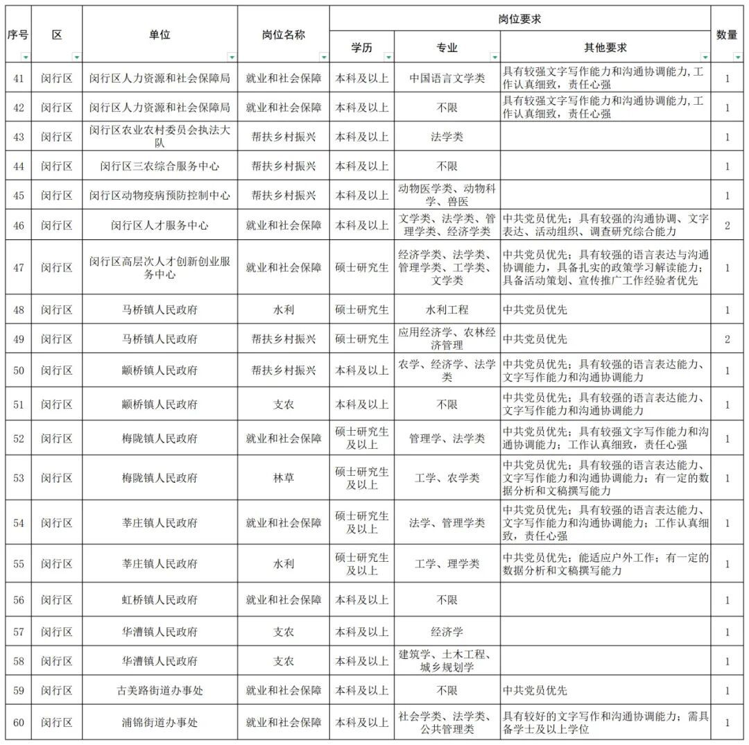 闵行区岗位一览表