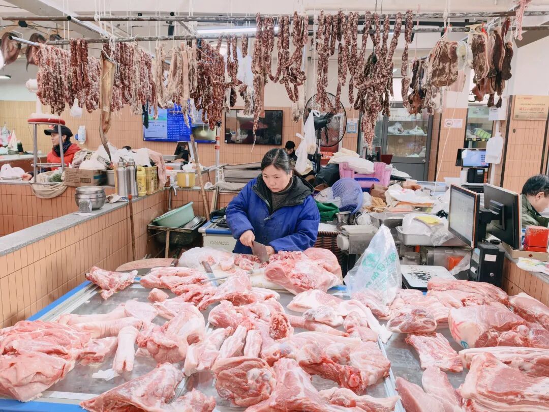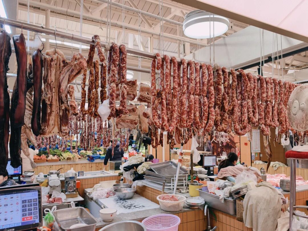 在肉类柜台前,腊肉、香肠等各式腌腊制品整齐悬挂,色泽鲜亮、香气隐约,路过的市民一眼便能感受到“年近了”的浓厚气息,停下脚步挑选心仪的年货。