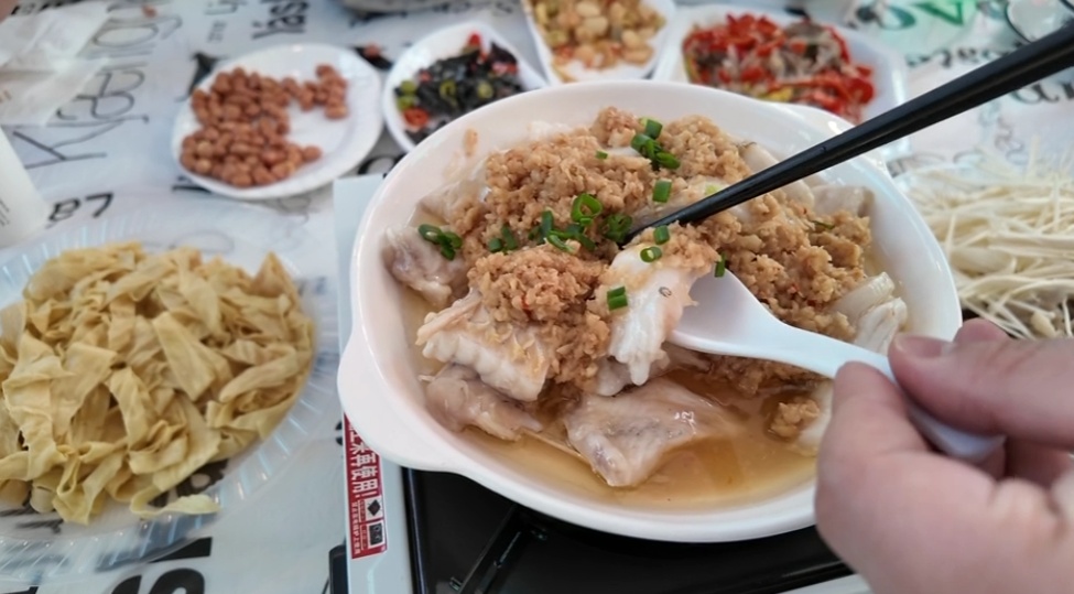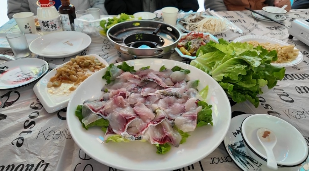 当天中午,活动重头戏——地道鲩鱼宴喜庆开席,以“年年有余”的美好寓意共迎新年。庄园内,十多桌鱼宴摆得满满当当,鱼宴选用产自崇明本地的鲩鱼,再佐以新鲜食材,以“一鱼多吃”的创意呈现。现场,袅袅鱼味弥漫飘香,炖煮、红烧、煎炸等各种烹饪手法将鲩鱼的鲜美发挥得淋漓尽致,引来不少游客和当地百姓品尝。“特别是鱼皮,味道很好,鱼汤煮的面条和馄饨,也非常鲜美。”一位游客说。