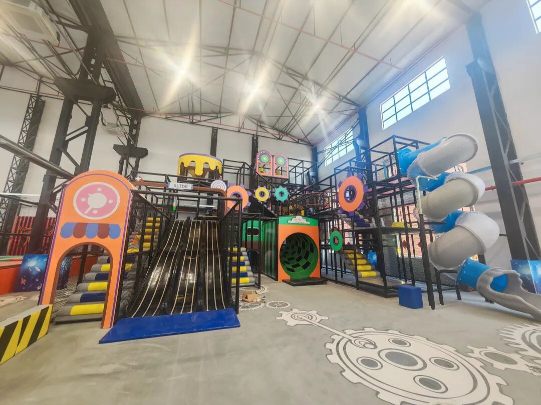 走进“吾要潮玩”游乐园,各项设施已准备就绪,庙镇吉祥物“貊貔”点缀其间,营造出温馨活泼的氛围。游乐园总面积为1204平方米,包含14个项目,如马里奥闯关、360自行车、卡丁车、高空滑索、攀岩墙等,兼具趣味性与挑战性,适合各年龄段的孩子游玩。