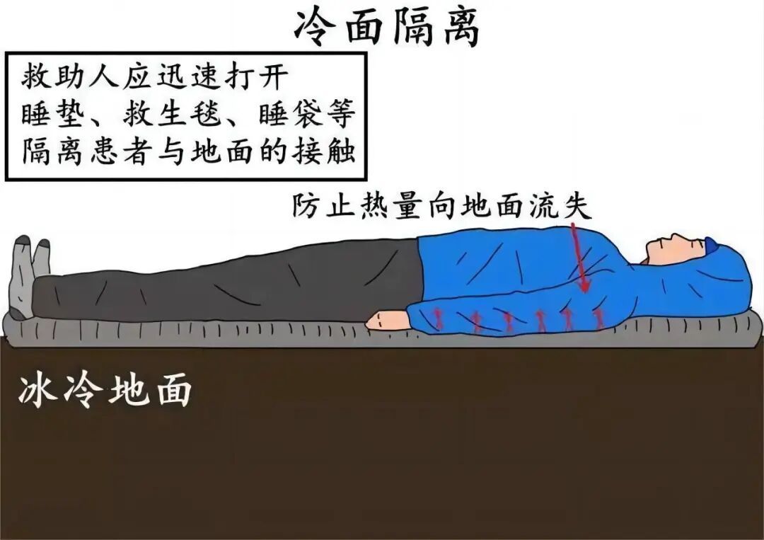 轻度失温:将失温者转移到避风、避雨的安全地带将人体与地面隔绝开来,更换干燥衣物。要避免对周围的肌肉(如手足)按摩,因为外周低温的血液回到内脏会带来更多伤害。可以烤火取暖,或者使用加热毯和室温加热,室温推荐在28℃。