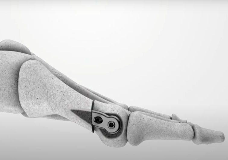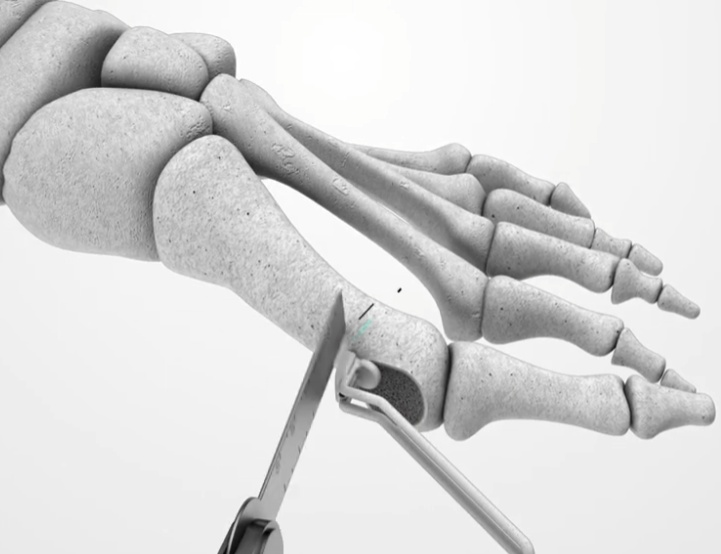 图注:手术原理示意:通过微小切口进行截骨,并将髓内板精准植入以重建足部力学结构