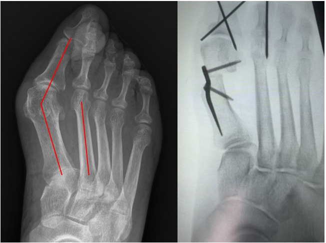 图注:术前 vs 术后的 X 光影像对比:术后拇外翻角(HVA)和第1、2跖骨间夹角(IMA)矫形至正常范围
