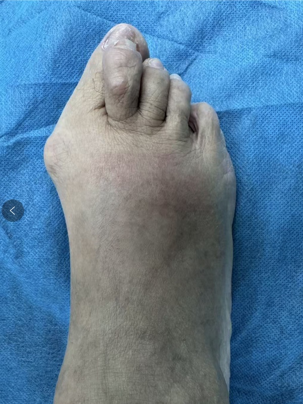 77岁的李奶奶(化名)受拇外翻困扰已有三十多年。随着畸形加重,大脚趾严重挤压第二趾,形成了典型的“叠趾畸形”。长期的摩擦疼痛让她每走一步都钻心地疼。