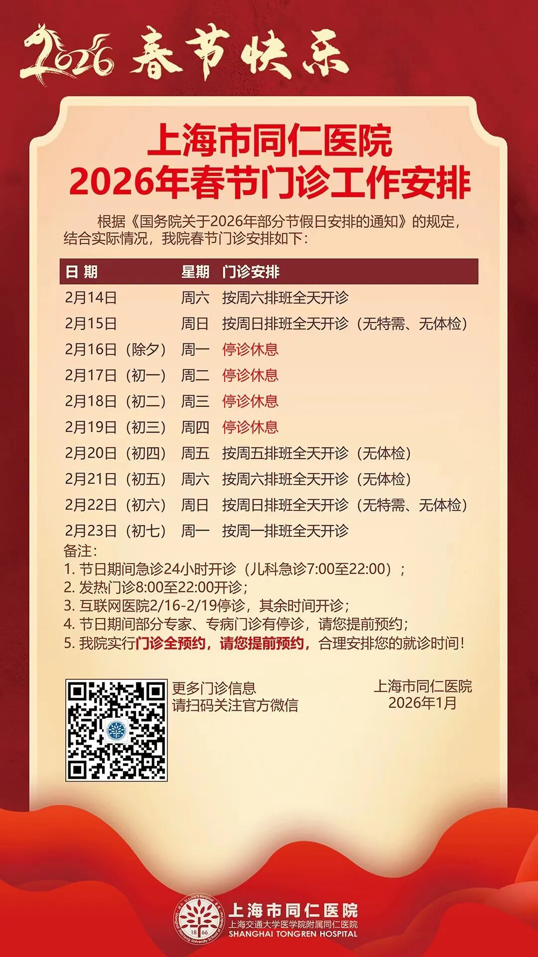 【通知】上海市同仁医院2026年春节门诊工作安排