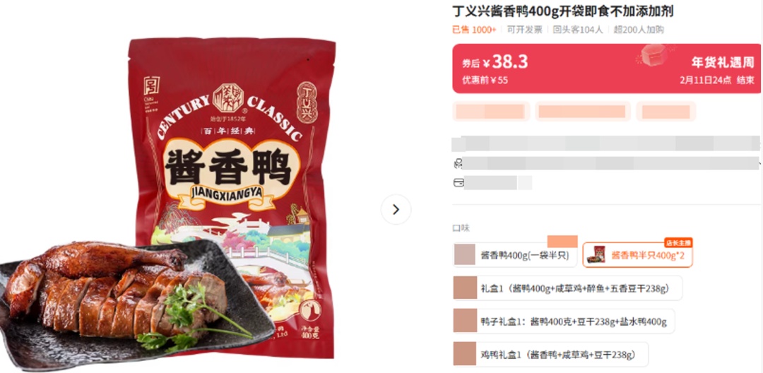 丁义兴酱香鸭(400克)市场价38.3元2袋