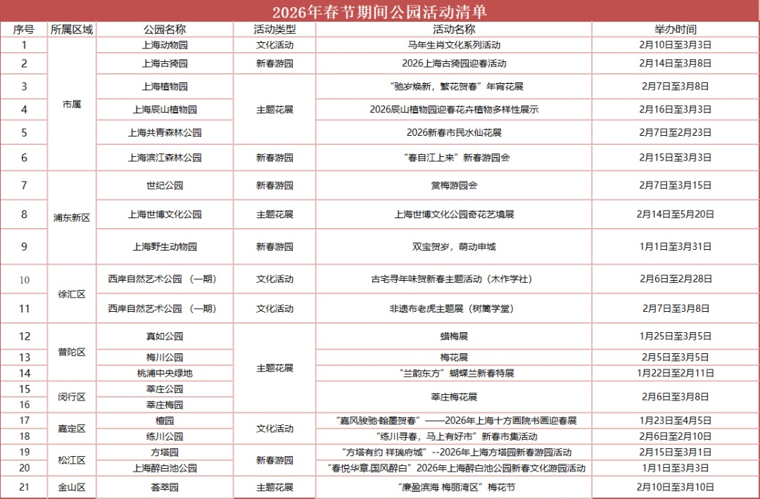 丙午马年即将到来,沪上公园将推出21场迎新春活动,包括主题花展、新春游园、文化活动三大类,重点突出“马”的主题和年味元素,内容涉及新春赏花、文展迎新、非遗体验、文艺演出等,营造喜庆的节日氛围。
